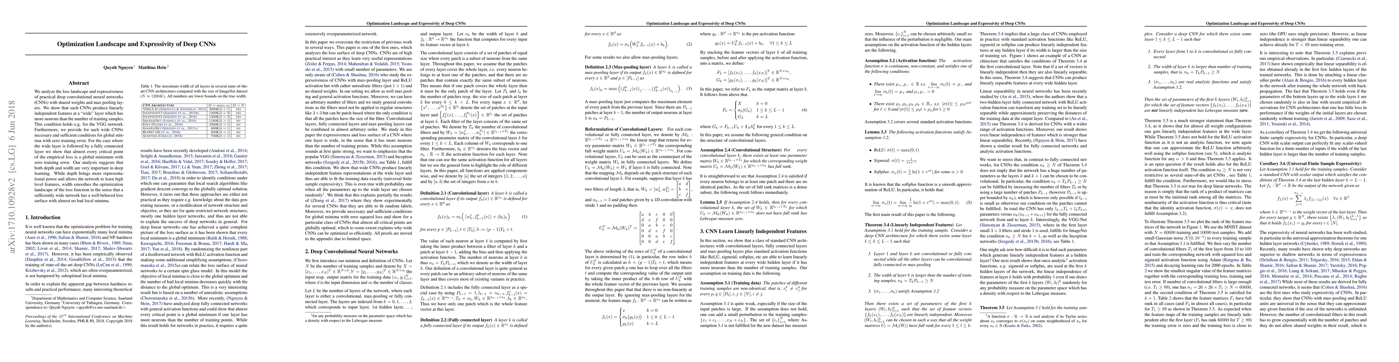We analyze the loss landscape and expressiveness of practical deep convolutional neural networks (CNNs) with shared weights and max pooling layers. We show that such CNNs produce linearly independent features at a "wide" layer which has more neurons than the number of training samples. This condition holds e.g. for the VGG network. Furthermore, we provide for such wide CNNs necessary and sufficient conditions for global minima with zero training error. For the case where the wide layer is followed by a fully connected layer we show that almost every critical point of the empirical loss is a global minimum with zero training error. Our analysis suggests that both depth and width are very important in deep learning. While depth brings more representational power and allows the network to learn high level features, width smoothes the optimization landscape of the loss function in the sense that a sufficiently wide network has a well-behaved loss surface with almost no bad local minima.