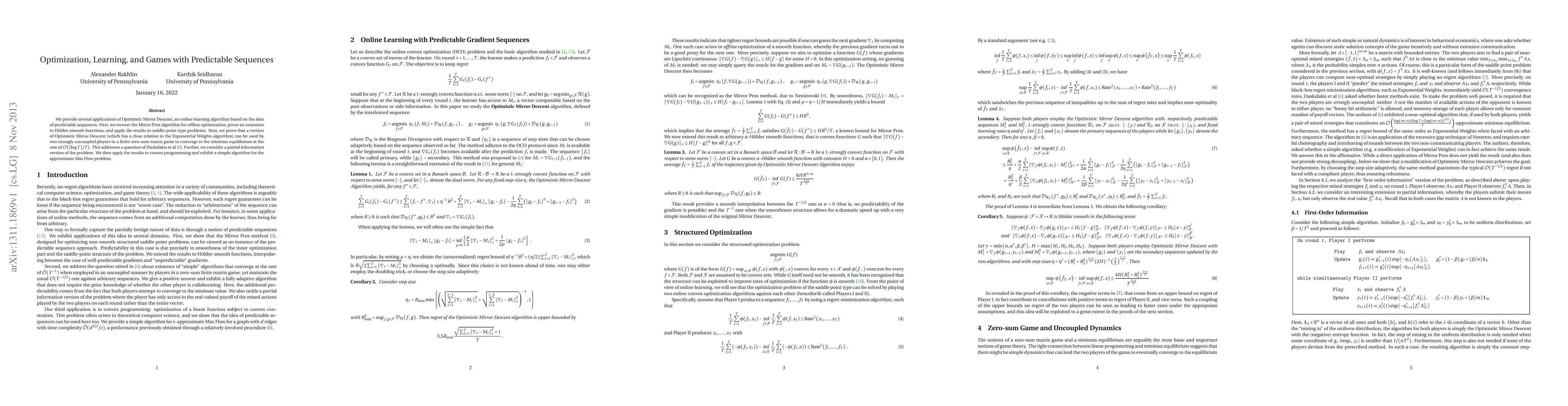 We provide several applications of Optimistic Mirror Descent, an online learning algorithm based on the idea of predictable sequences. First, we recover the Mirror Prox algorithm for offline optimization, prove an extension to Holder-smooth functions, and apply the results to saddle-point type problems. Next, we prove that a version of Optimistic Mirror Descent (which has a close relation to the Exponential Weights algorithm) can be used by two strongly-uncoupled players in a finite zero-sum matrix game to converge to the minimax equilibrium at the rate of O((log T)/T). This addresses a question of Daskalakis et al 2011. Further, we consider a partial information version of the problem. We then apply the results to convex programming and exhibit a simple algorithm for the approximate Max Flow problem.