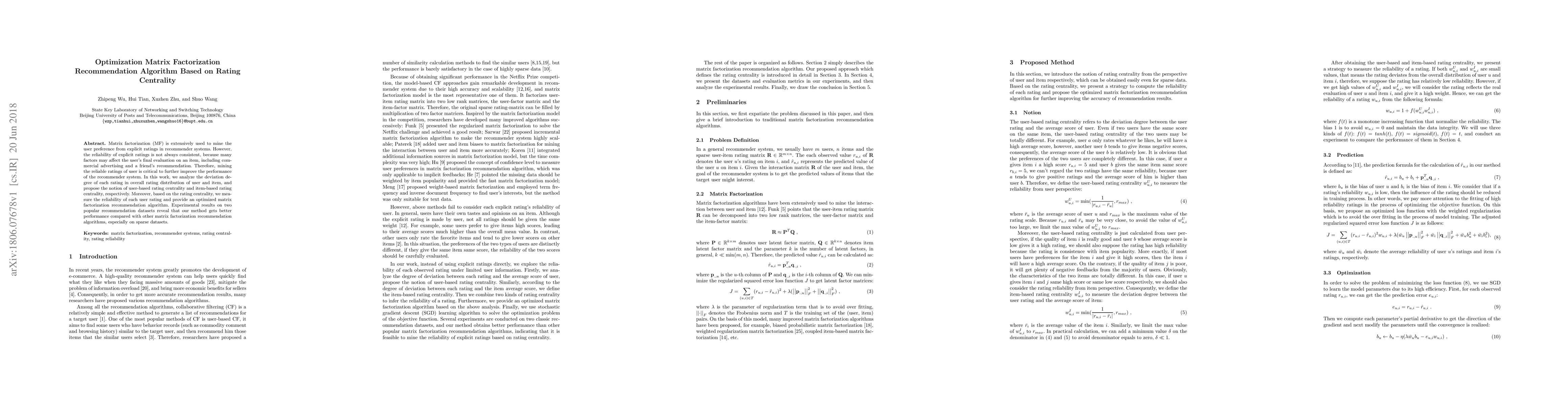This paper proposes an optimized matrix factorization recommendation algorithm that incorporates user-based and item-based rating centrality to measure the reliability of user ratings. Experimental results show improved performance over other matrix factorization methods, particularly on sparse datasets.