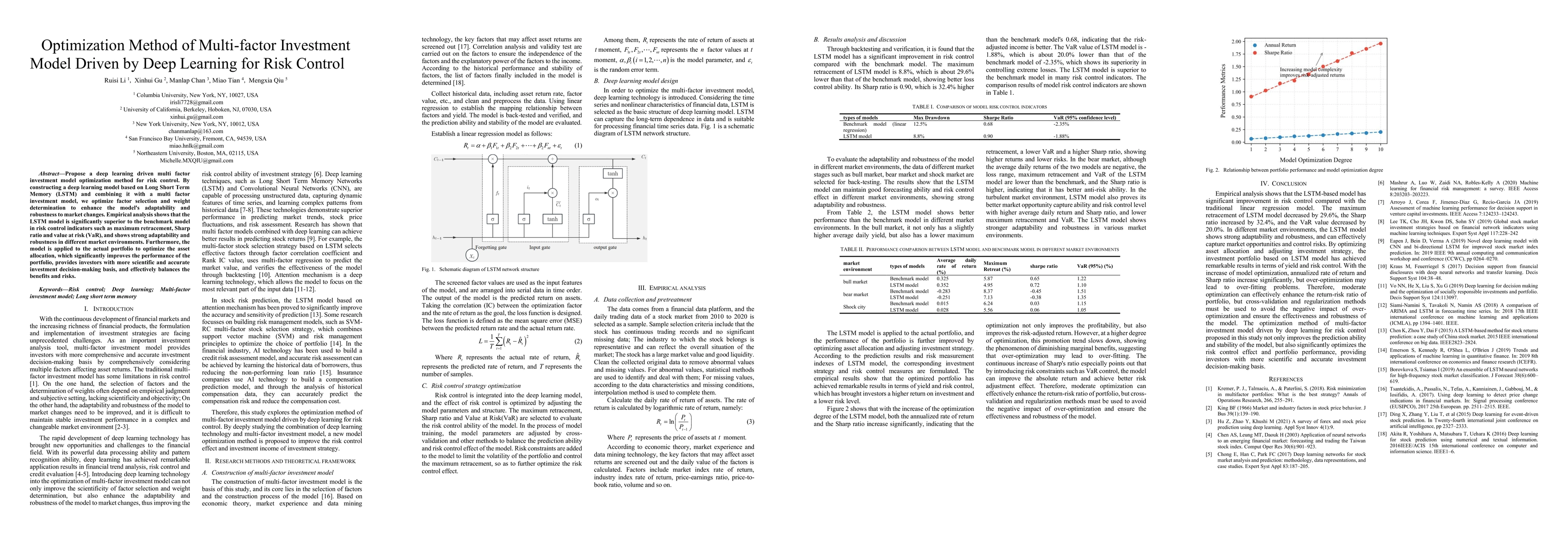 Propose a deep learning driven multi factor investment model optimization method for risk control. By constructing a deep learning model based on Long Short Term Memory (LSTM) and combining it with a multi factor investment model, we optimize factor selection and weight determination to enhance the model's adaptability and robustness to market changes. Empirical analysis shows that the LSTM model is significantly superior to the benchmark model in risk control indicators such as maximum retracement, Sharp ratio and value at risk (VaR), and shows strong adaptability and robustness in different market environments. Furthermore, the model is applied to the actual portfolio to optimize the asset allocation, which significantly improves the performance of the portfolio, provides investors with more scientific and accurate investment decision-making basis, and effectively balances the benefits and risks.