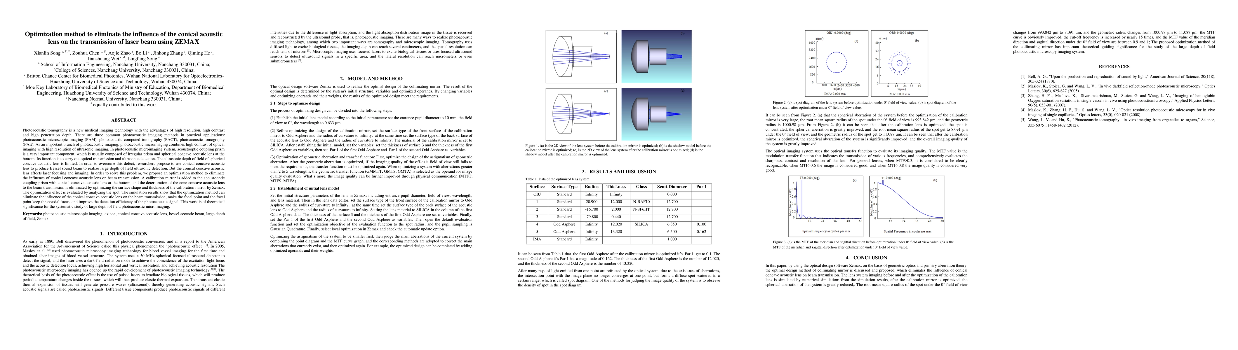 This paper proposes an optimization method using Zemax to design a collimating mirror that eliminates the conical acoustic lens's influence on laser beam transmission. The optimized mirror significantly reduces spherical aberration, improves MTF, and enhances imaging quality in photoacoustic microscopy.