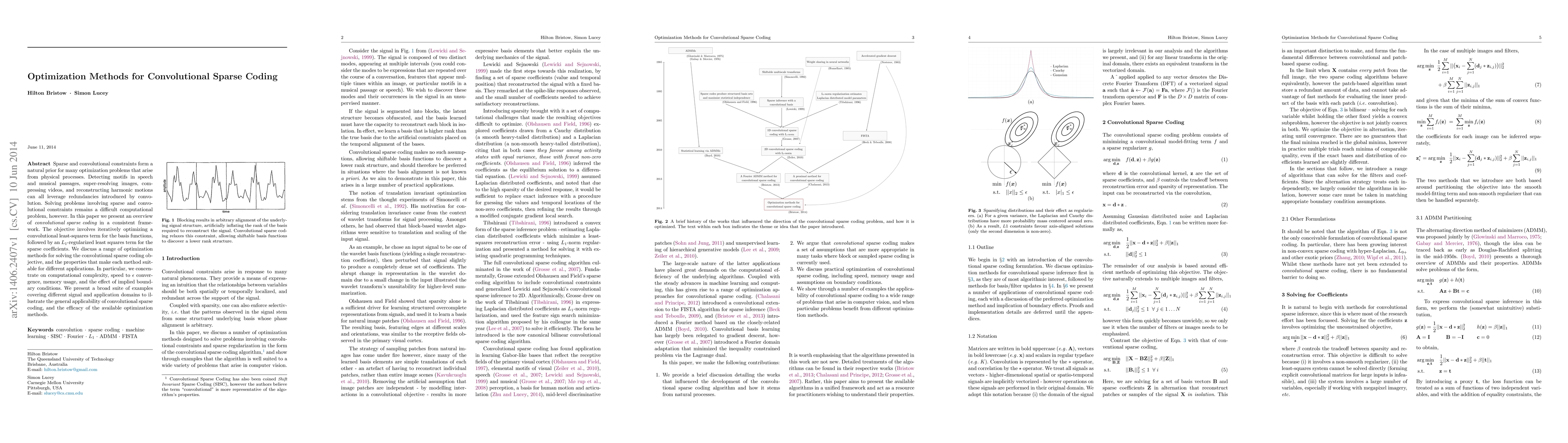 Sparse and convolutional constraints form a natural prior for many optimization problems that arise from physical processes. Detecting motifs in speech and musical passages, super-resolving images, compressing videos, and reconstructing harmonic motions can all leverage redundancies introduced by convolution. Solving problems involving sparse and convolutional constraints remains a difficult computational problem, however. In this paper we present an overview of convolutional sparse coding in a consistent framework. The objective involves iteratively optimizing a convolutional least-squares term for the basis functions, followed by an L1-regularized least squares term for the sparse coefficients. We discuss a range of optimization methods for solving the convolutional sparse coding objective, and the properties that make each method suitable for different applications. In particular, we concentrate on computational complexity, speed to {\epsilon} convergence, memory usage, and the effect of implied boundary conditions. We present a broad suite of examples covering different signal and application domains to illustrate the general applicability of convolutional sparse coding, and the efficacy of the available optimization methods.