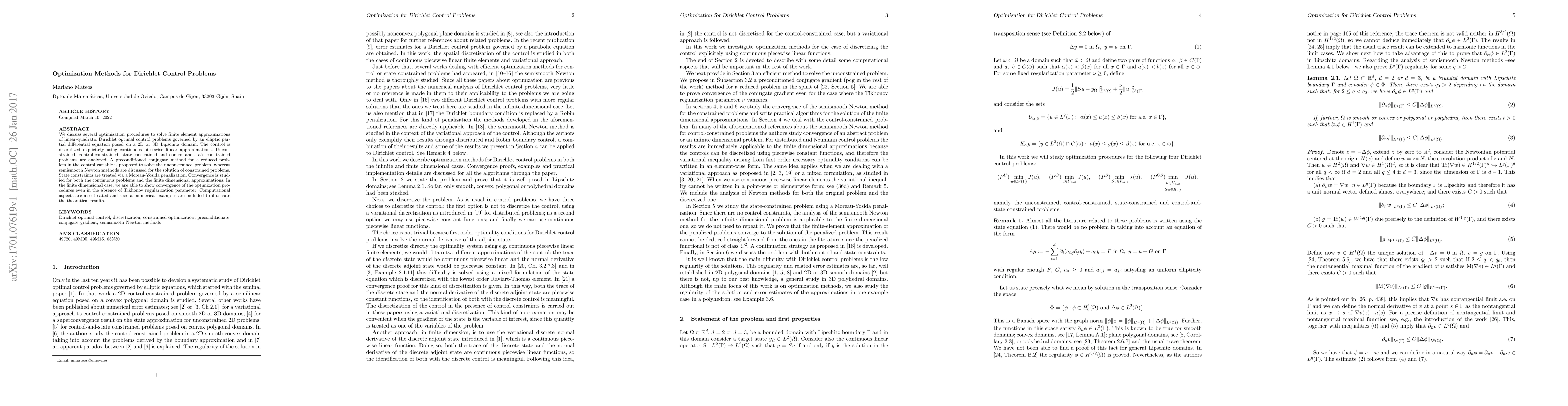 This paper explores optimization techniques for solving linear-quadratic Dirichlet optimal control problems using finite element methods. It proposes a preconditioned conjugate method for unconstrained problems and semismooth Newton methods for constrained problems, demonstrating convergence and computational effectiveness through numerical examples.