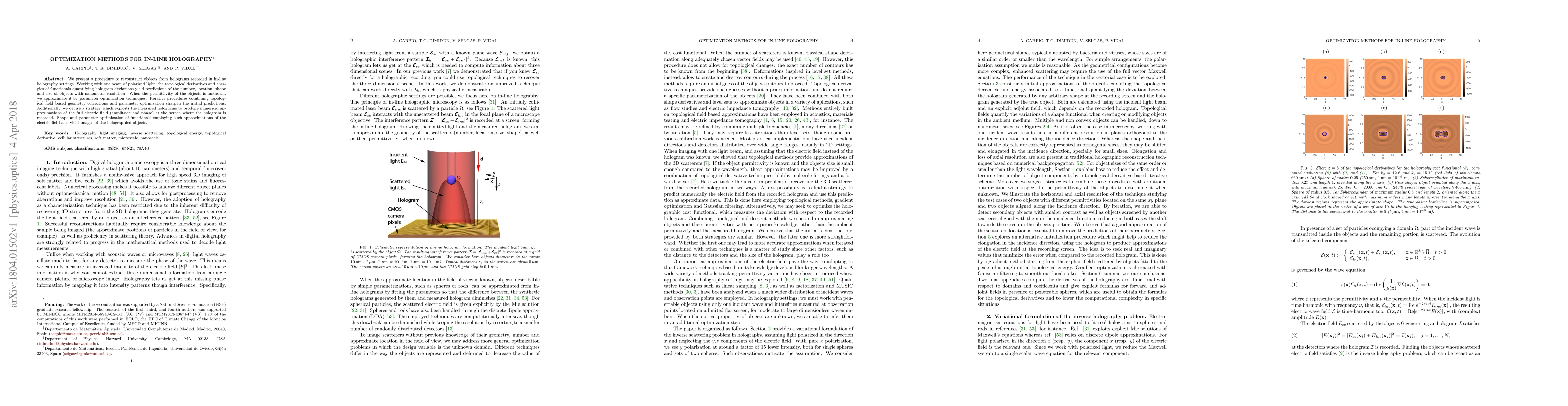 We present a procedure to reconstruct objects from holograms recorded in in-line holography settings. Working with one beam of polarized light, the topological derivatives and energies of functionals quantifying hologram deviations yield predictions of the number, location, shape and size of objects with nanometer resolution. When the permittivity of the objects is unknown, we approximate it by parameter optimization techniques. Iterative procedures combining topological field based geometry corrections and parameter optimization sharpen the initial predictions. Additionally, we devise a strategy which exploits the measured holograms to produce numerical approximations of the full electric field (amplitude and phase) at the screen where the hologram is recorded. Shape and parameter optimization of functionals employing such approximations of the electric field also yield images of the holographied objects.