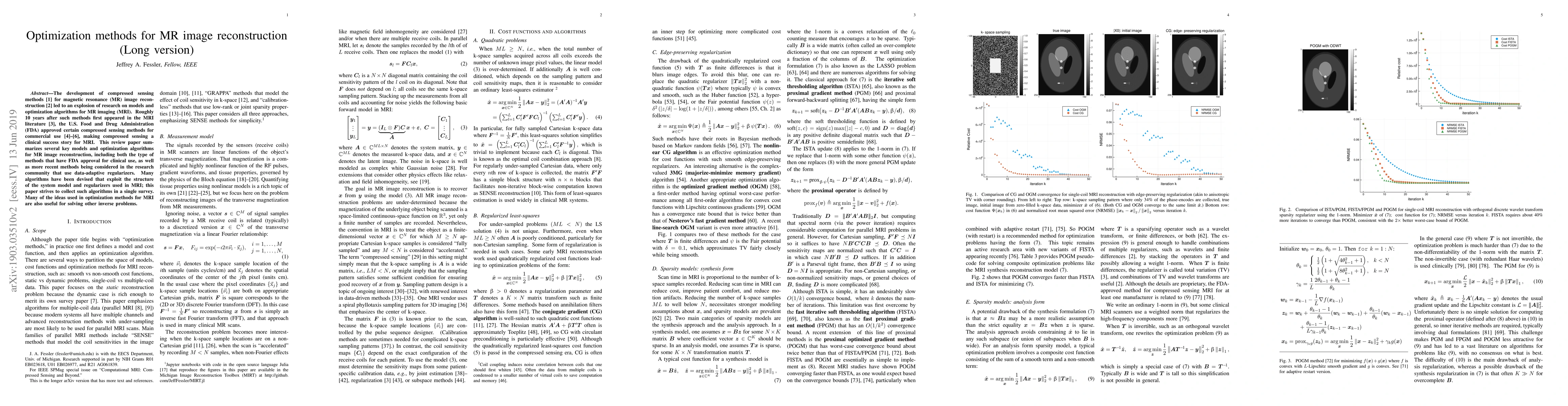This paper reviews key models and optimization algorithms for MR image reconstruction, highlighting both FDA-approved methods and recent research-driven techniques using data-adaptive regularizers, with a focus on algorithms that exploit the structural properties of MRI systems. The insights gained are also applicable to solving other inverse problems.