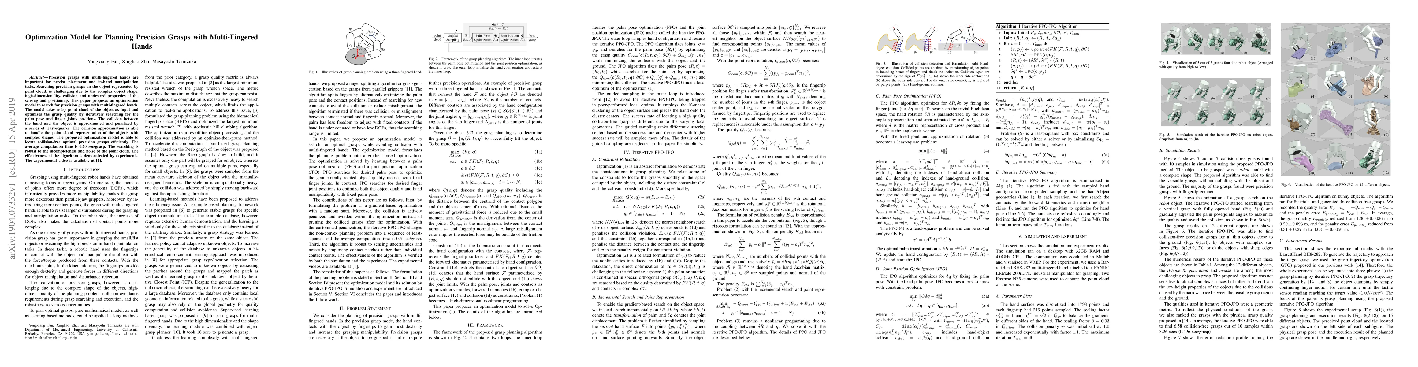 This paper proposes an optimization model to efficiently search for precision grasps using multi-fingered hands, handling complex object shapes and noise in point cloud data. The model optimizes grasp quality through iterative adjustments of palm pose and finger positions, efficiently locating collision-free optimal grasps in an average of 0.50 seconds per grasp.