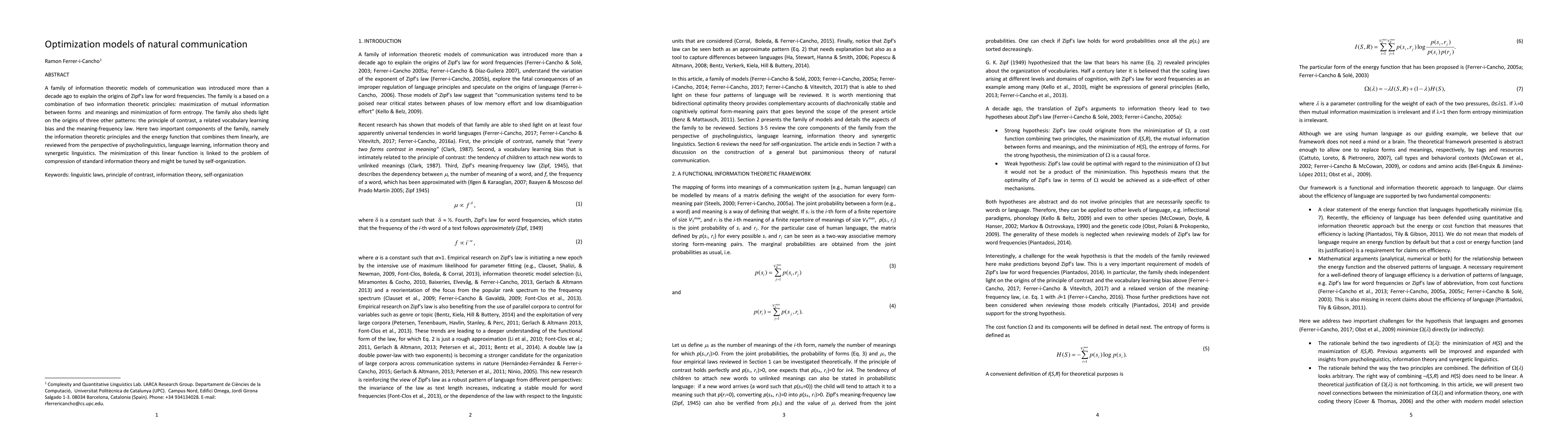 A family of information theoretic models of communication was introduced more than a decade ago to explain the origins of Zipf's law for word frequencies. The family is a based on a combination of two information theoretic principles: maximization of mutual information between forms and meanings and minimization of form entropy. The family also sheds light on the origins of three other patterns: the principle of contrast, a related vocabulary learning bias and the meaning-frequency law. Here two important components of the family, namely the information theoretic principles and the energy function that combines them linearly, are reviewed from the perspective of psycholinguistics, language learning, information theory and synergetic linguistics. The minimization of this linear function is linked to the problem of compression of standard information theory and might be tuned by self-organization.