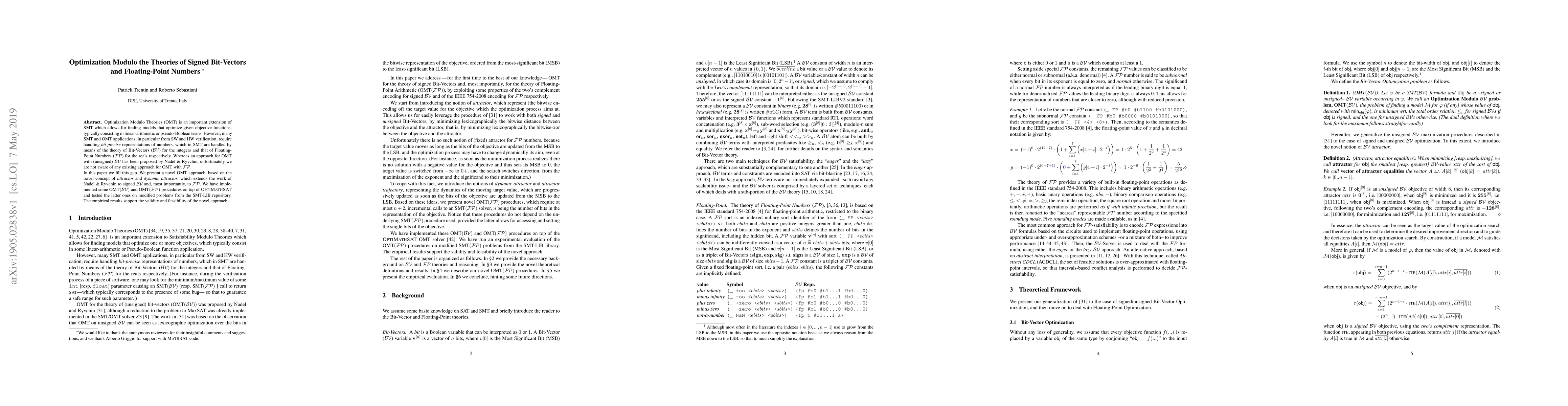 Optimization Modulo Theories (OMT) is an important extension of SMT which allows for finding models that optimize given objective functions, typically consisting in linear-arithmetic or pseudo-Boolean terms. However, many SMT and OMT applications, in particular from SW and HW verification, require handling bit-precise representations of numbers, which in SMT are handled by means of the theory of Bit-Vectors (BV) for the integers and that of Floating-Point Numbers (FP) for the reals respectively. Whereas an approach for OMT with (unsigned) BV has been proposed by Nadel & Ryvchin, unfortunately we are not aware of any existing approach for OMT with FP. In this paper we fill this gap. We present a novel OMT approach, based on the novel concept of attractor and dynamic attractor, which extends the work of Nadel & Ryvchin to signed BV and, most importantly, to FP. We have implemented some OMT(BV) and OMT(FP) procedures on top of OptiMathSAT and tested the latter ones on modified problems from the SMT-LIB repository. The empirical results support the validity and feasibility of the novel approach.