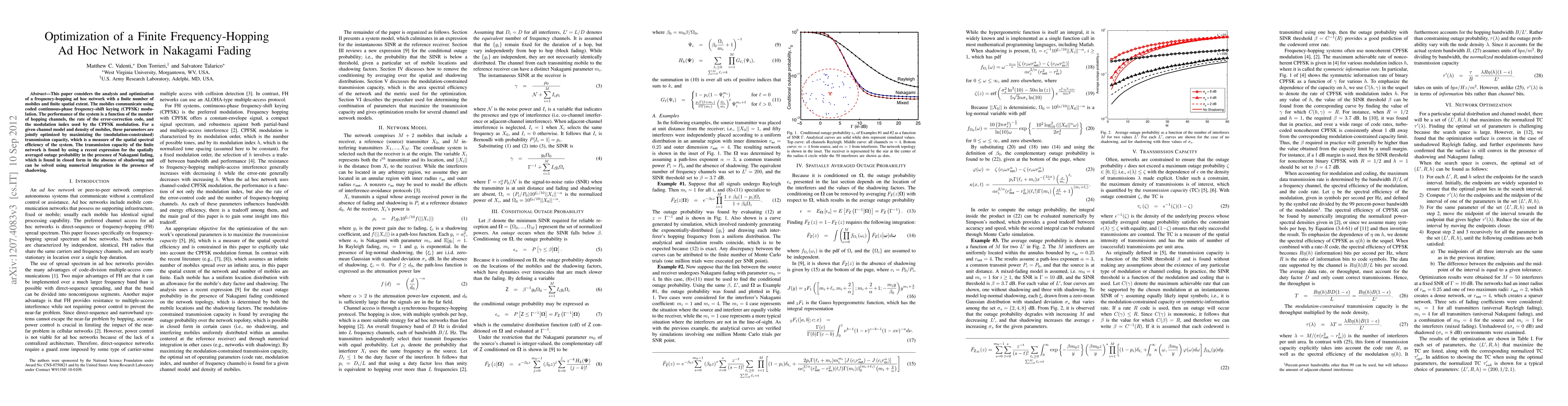 This paper optimizes a finite frequency-hopping ad hoc network under Nakagami fading, focusing on maximizing the modulation-constrained transmission capacity by jointly adjusting the number of hopping channels, error-correction code rate, and modulation index for coded continuous-phase frequency-shift keying modulation. The optimization leverages a closed-form expression for spatially averaged outage probability in the absence of shadowing and a numerical integration approach when shadowing is present.
