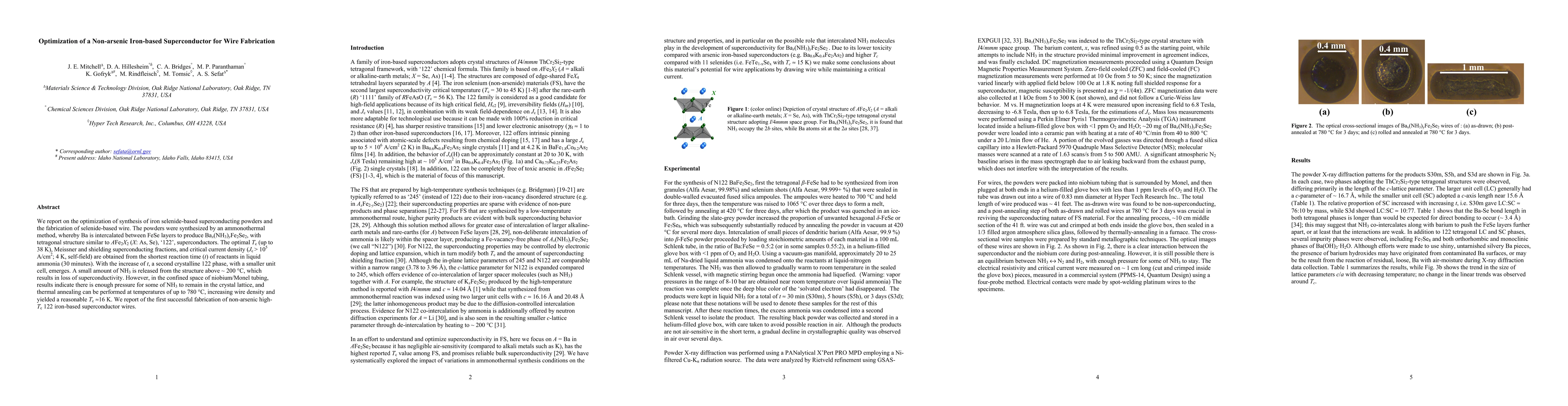 This paper optimizes the synthesis of iron-selenide superconductors with a '122' composition, achieving a critical temperature (Tc) of 38 K and critical current density (Jc) of 10^5 A/cm² at 4 K. It also demonstrates the successful fabrication of ~40 ft of superconducting wire, marking a proof of concept for these materials.