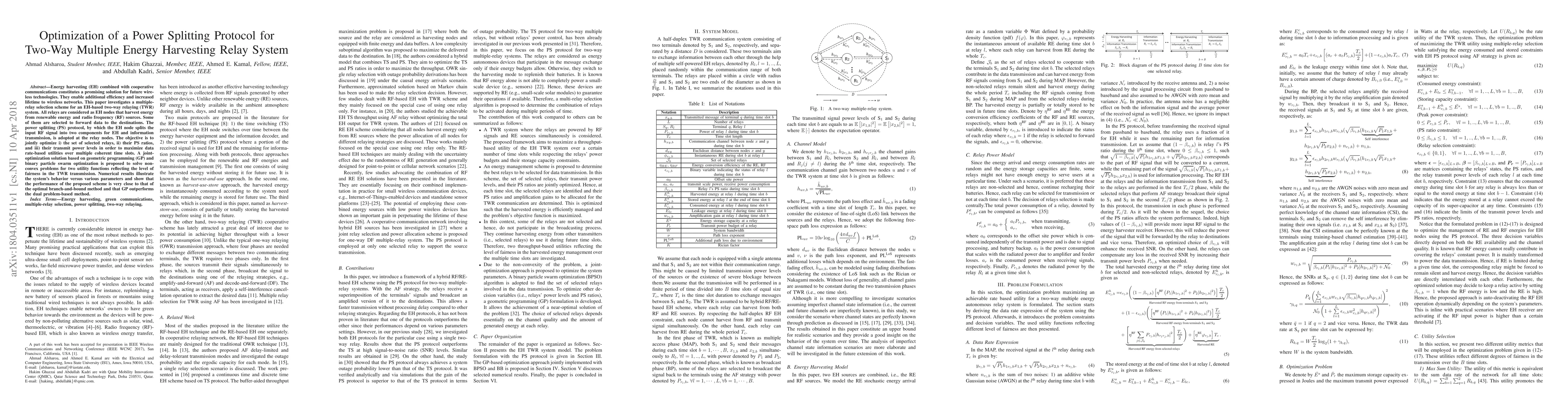 This paper proposes an optimization protocol for a two-way multiple energy harvesting relay system, focusing on selecting relays, optimizing their power splitting ratios, and transmit power levels to maximize data rate utilities. A joint-optimization solution using geometric programming and binary particle swarm optimization is developed to address non-convex problems, achieving performance close to optimal methods.