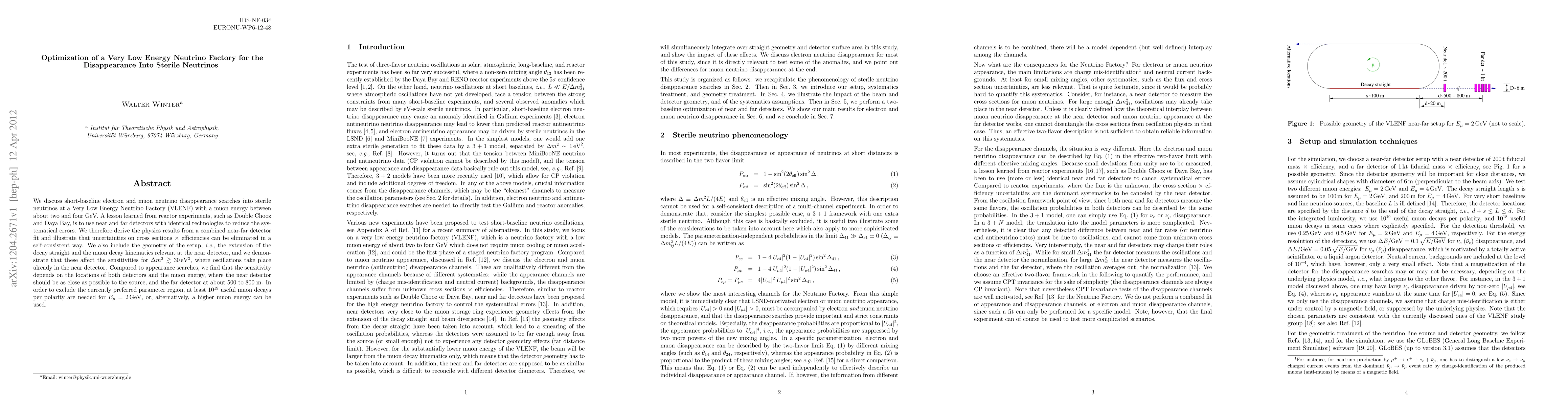 We discuss short-baseline electron and muon neutrino disappearance searches into sterile neutrinos at a Very Low Energy Neutrino Factory (VLENF) with a muon energy between about two and four GeV. A lesson learned from reactor experiments, such as Double Chooz and Daya Bay, is to use near and far detectors with identical technologies to reduce the systematical errors. We therefore derive the physics results from a combined near-far detector fit and illustrate that uncertainties on cross sections x efficiencies can be eliminated in a self-consistent way. We also include the geometry of the setup, i.e., the extension of the decay straight and the muon decay kinematics relevant at the near detector, and we demonstrate that these affect the sensitivities for Delta m^2 > 30 eV^2, where oscillations take place already in the near detector. Compared to appearance searches, we find that the sensitivity depends on the locations of both detectors and the muon energy, where the near detector should be as close as possible to the source, and the far detector at about 500 to 800m. In order to exclude the currently preferred parameter region, at least 10^19 useful muon decays per polarity are needed for E_mu=2 GeV, or, alternatively, a higher muon energy can be used.