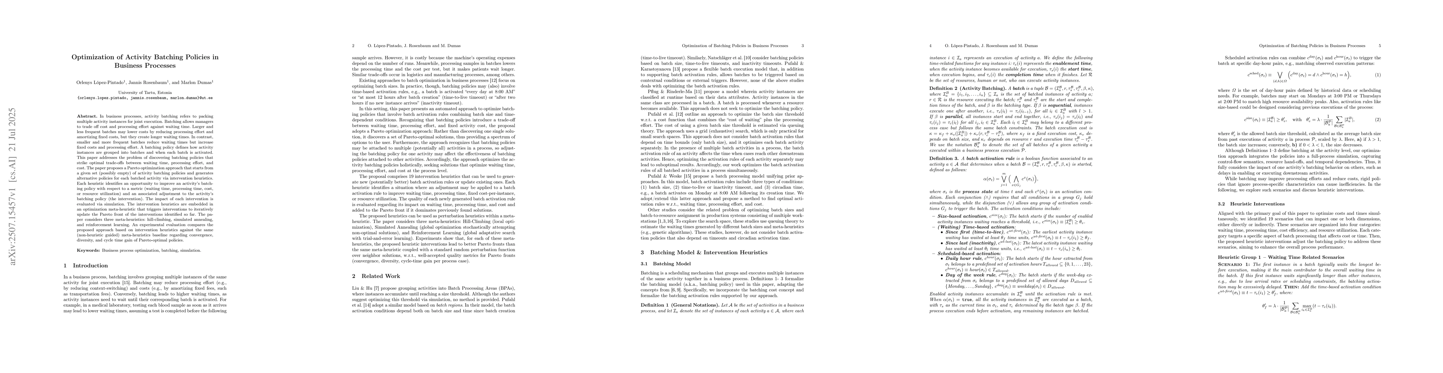 This research is significant as it automates the optimization of batching policies, reducing configuration complexity and enabling practical adoption in organizations without in-house experts, thereby improving efficiency in business processes.