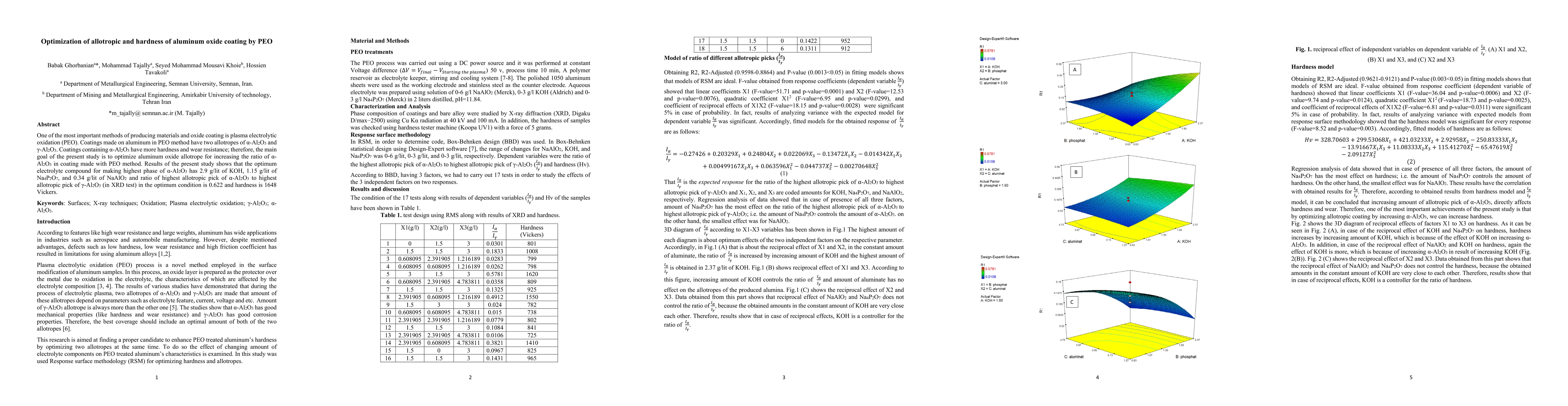 One of the most important methods of producing materials and oxide coating is plasma electrolytic oxidation (PEO). Coatings made on aluminum in PEO method have two allotropes of $\alpha$-Al$_2$O$_3$ and $\gamma$-Al$_2$O$_3$. Coatings containing $\alpha$-Al$_2$O$_3$ have more hardness and wear resistance; therefore, the main goal of the present study is to optimize aluminum oxide allotrope for increasing the ratio of $\alpha$-Al$_2$O$_3$ in coating made with PEO method. Results of the present study shows that the optimum electrolyte compound for making highest phase of $\alpha$-Al$_2$O$_3$ has 2.9 g/lit of KOH, 1.15 g/lit of Na4P2O7, and 0.34 g/lit of NaAlO2 and ratio of highest allotropic pick of $\alpha$-Al$_2$O$_3$ to highest allotropic pick of $\gamma$-Al$_2$O$_3$ (in XRD test) in the optimum condition is 0.622 and hardness is 1648 Vickers.