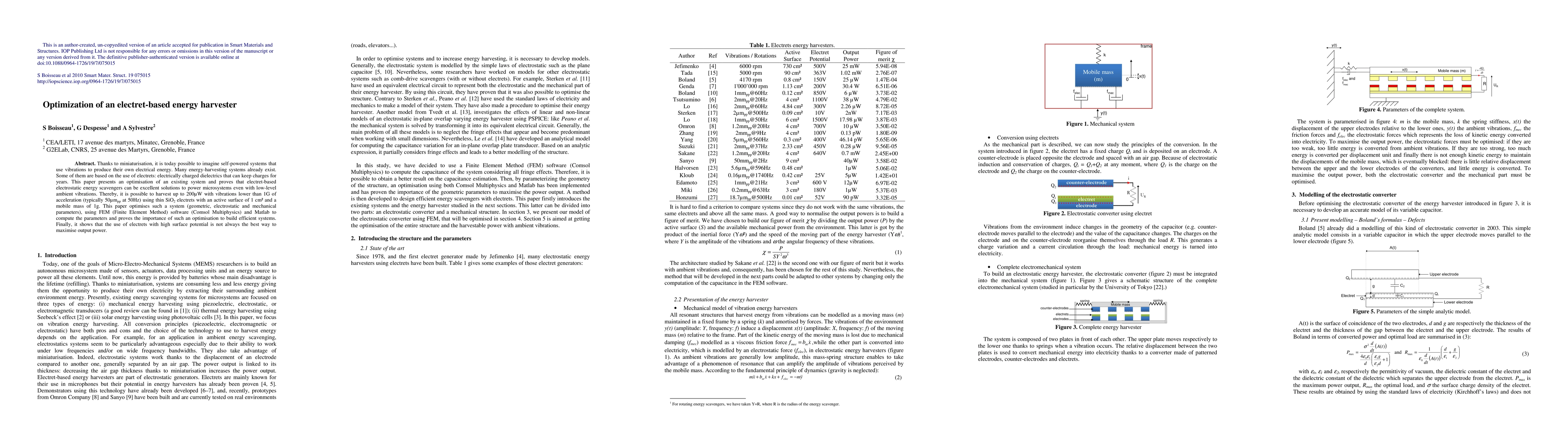 Thanks to miniaturisation, it is today possible to imagine self-powered systems that use vibrations to produce their own electrical energy. Many energy-harvesting systems already exist. Some of them are based on the use of electrets: electrically charged dielectrics that can keep charges for years. This paper presents an optimisation of an existing system and proves that electret-based electrostatic energy scavengers can be excellent solutions to power microsystems even with low-level ambient vibrations. Thereby, it is possible to harvest up to 200\muW with vibrations lower than 1G of acceleration (typically 50\mumpp at 50Hz) using thin SiO2 electrets with an active surface of 1 cm^{2} and a mobile mass of 1g. This paper optimises such a system (geometric, electrostatic and mechanical parameters), using FEM (Finite Element Method) software (Comsol Multiphysics) and Matlab to compute the parameters and proves the importance of such an optimisation to build efficient systems. Finally, it shows that the use of electrets with high surface potential is not always the best way to maximise output power.
