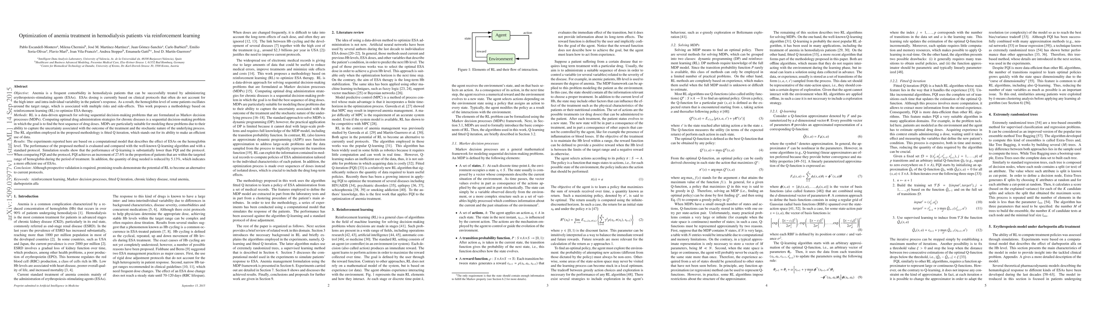 This paper proposes a reinforcement learning approach to optimize erythropoiesis-stimulating agents dosing for anemia treatment in hemodialysis patients, showing that fitted Q iteration outperforms Q-learning and standard protocols in simulations. Further validation is needed to confirm its clinical potential.