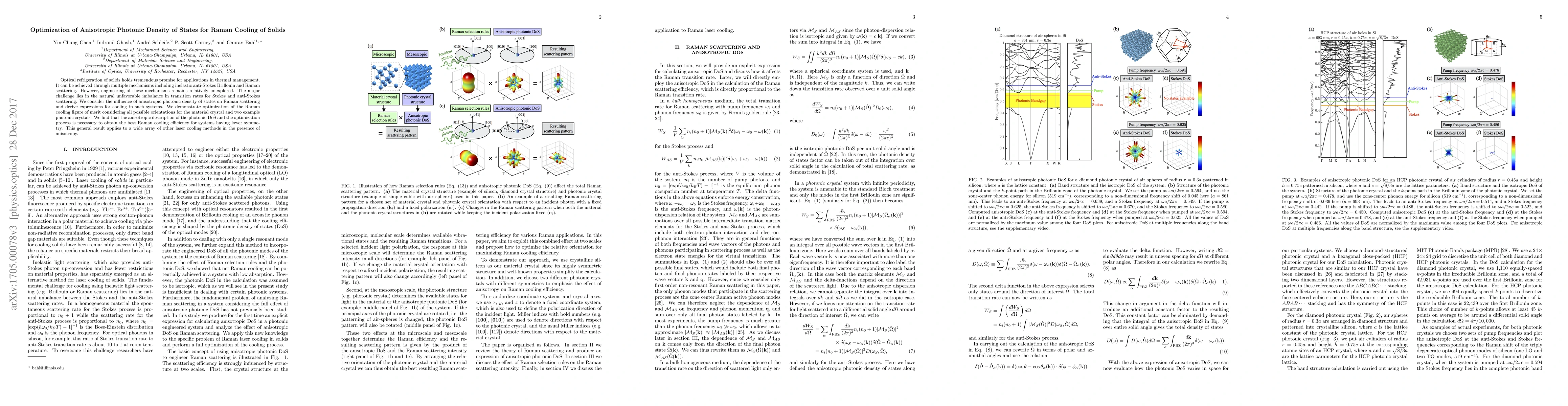 Optical refrigeration of solids holds tremendous promise for applications in thermal management. It can be achieved through multiple mechanisms including inelastic anti-Stokes Brillouin and Raman scattering. However, engineering of these mechanisms remains relatively unexplored. The major challenge lies in the natural unfavorable imbalance in transition rates for Stokes and anti-Stokes scattering. We consider the influence of anisotropic photonic density of states on Raman scattering and derive expressions for cooling in such systems. We demonstrate optimization of the Raman cooling figure of merit considering all possible orientations for the material crystal and two example photonic crystals. We find that the anisotropic description of the photonic DoS and the optimization process is necessary to obtain the best Raman cooling efficiency for systems having lower symmetry. This general result applies to a wide array of other laser cooling methods in the presence of anisotropy.