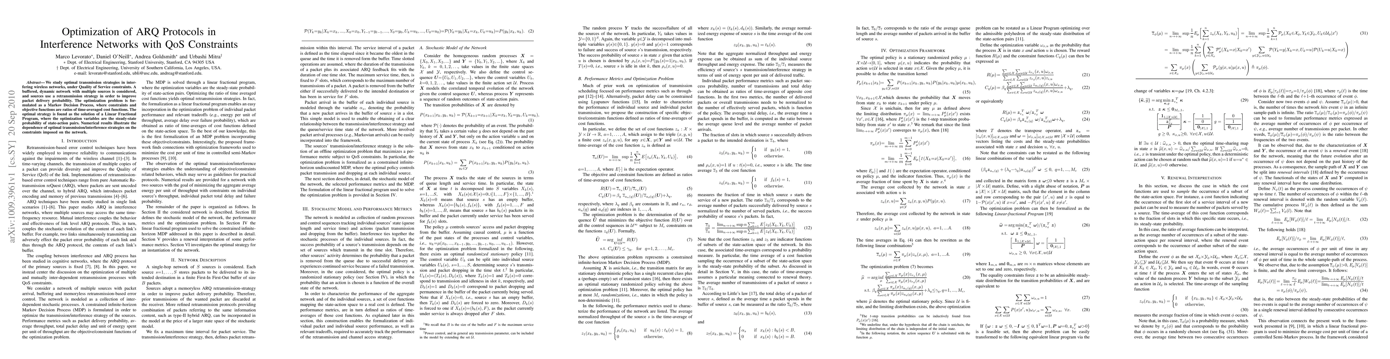 We study optimal transmission strategies in interfering wireless networks, under Quality of Service constraints. A buffered, dynamic network with multiple sources is considered, and sources use a retransmission strategy in order to improve packet delivery probability. The optimization problem is formulated as a Markov Decision Process, where constraints and objective functions are ratios of time-averaged cost functions. The optimal strategy is found as the solution of a Linear Fractional Program, where the optimization variables are the steady-state probability of state-action pairs. Numerical results illustrate the dependence of optimal transmission/interference strategies on the constraints imposed on the network.