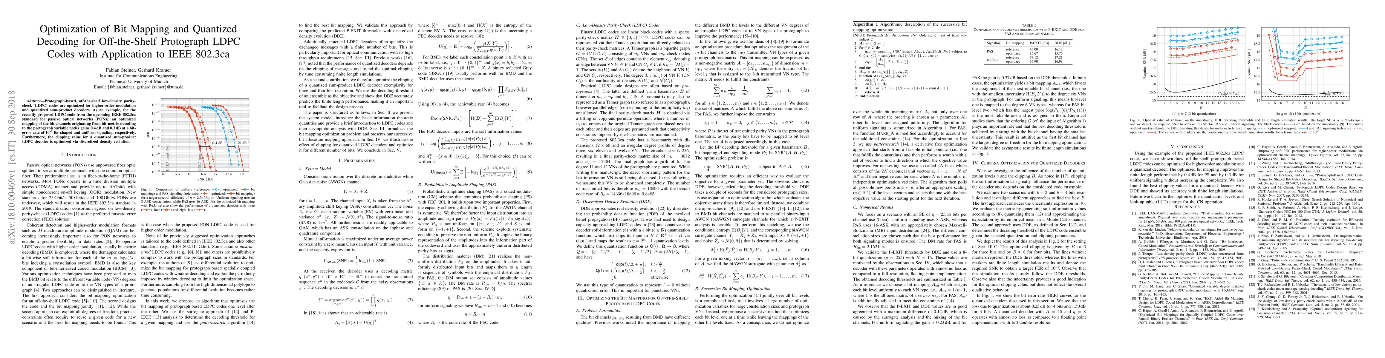 This paper optimizes bit mapping and quantized decoding for off-the-shelf protograph LDPC codes, achieving a 0.4 dB gain for shaped signaling and 0.3 dB for uniform signaling at a bit-error rate of 1e-6, specifically applied to the IEEE 802.3ca standard for passive optical networks. The optimization includes an improved mapping of bit channels and an optimized clipping value for the decoder.