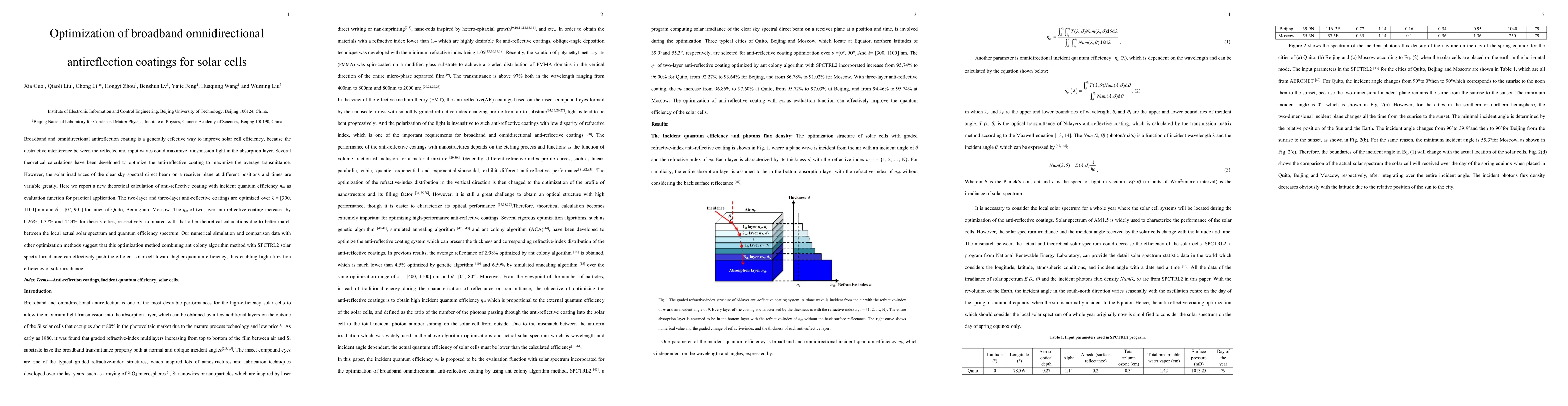 This paper optimizes broadband omnidirectional antireflection coatings for solar cells using a new theoretical calculation based on incident quantum efficiency. The optimized two-layer and three-layer coatings show significant improvements in efficiency for cities like Quito, Beijing, and Moscow, outperforming other methods by better matching local solar spectra.