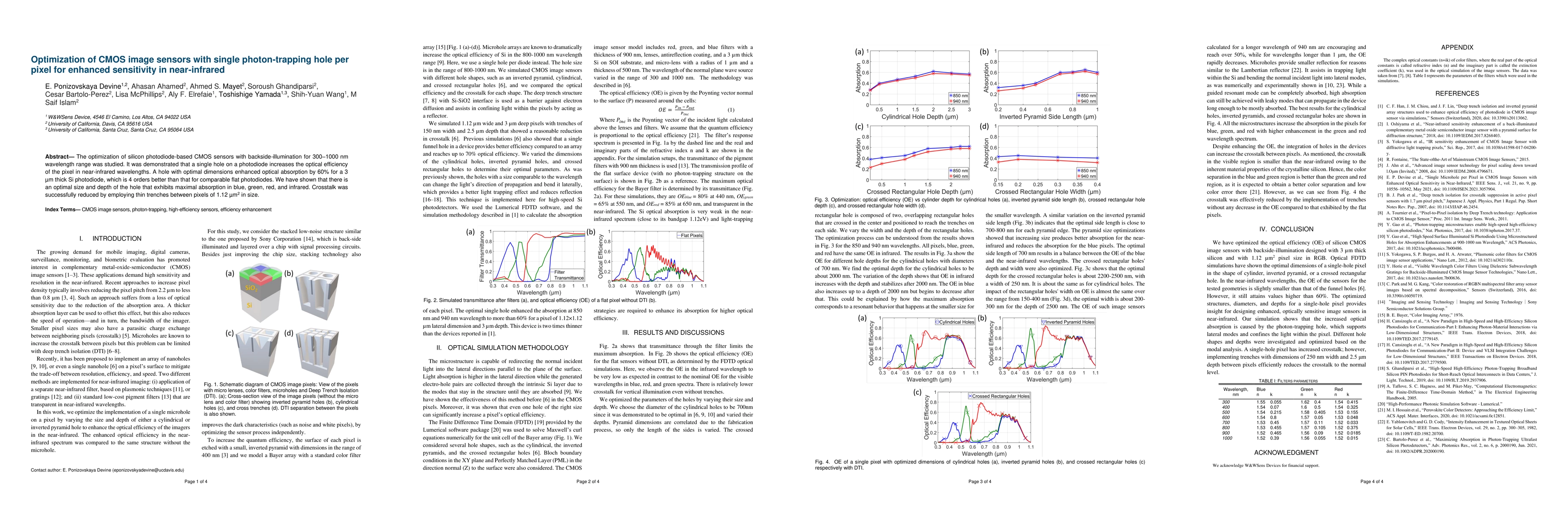 This study optimized CMOS image sensors with a single photon-trapping hole per pixel to enhance sensitivity in near-infrared light, achieving 60% increased optical absorption.