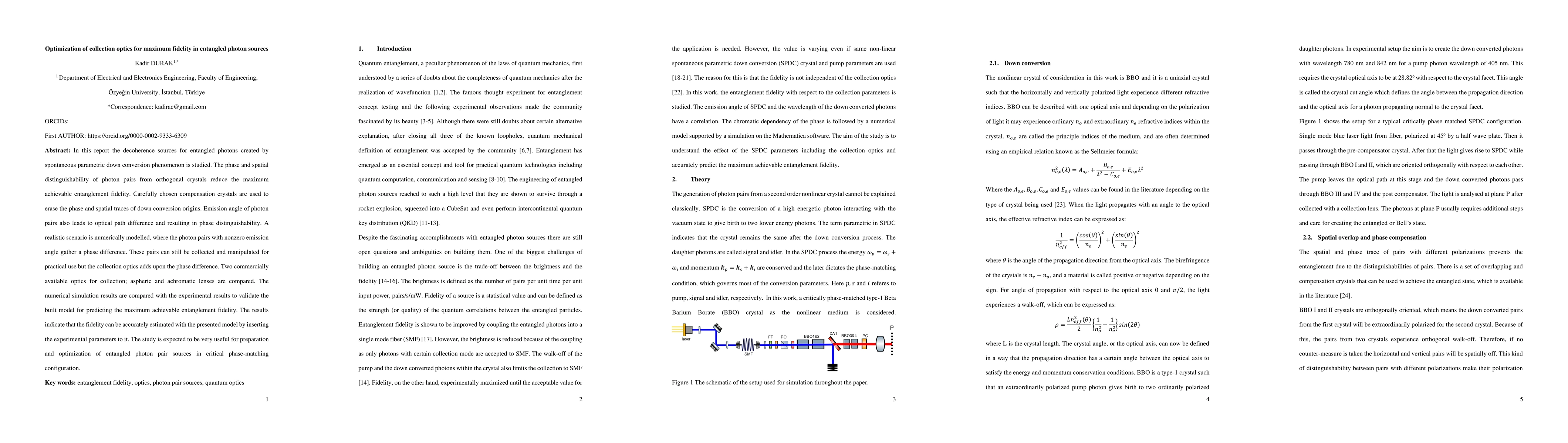 In this report the decoherence sources for entangled photons created by spontaneous parametric down conversion phenomenon is studied. The phase and spatial distinguishability of photon pairs from orthogonal crystals reduce the maximum achievable entanglement fidelity. Carefully chosen compensation crystals are used to erase the phase and spatial traces of down conversion origins. Emission angle of photon pairs also leads to optical path difference and resulting in phase distinguishability. A realistic scenario is numerically modelled, where the photon pairs with nonzero emission angle gather a phase difference. These pairs can still be collected and manipulated for practical use but the collection optics adds upon the phase difference. Two commercially available optics for collection; aspheric and achromatic lenses are compared. The numerical simulation results are compared with the experimental results to validate the built model for predicting the maximum achievable entanglement fidelity. The results indicate that the fidelity can be accurately estimated with the presented model by inserting the experimental parameters to it. The study is expected to be very useful for preparation and optimization of entangled photon pair sources in critical phase-matching configuration.
