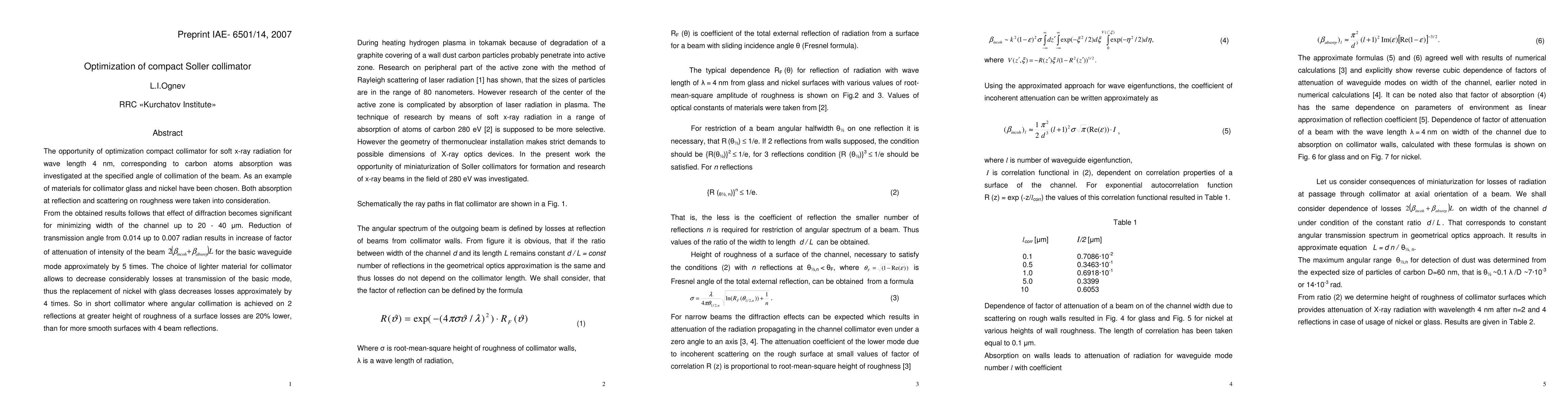 This paper investigates optimizing a compact Soller collimator for soft x-ray radiation at 4 nm, focusing on length, material, and wall roughness. Results show significant diffraction effects for channel widths up to 0.04 mm, with optimal performance achieved using lighter materials with greater roughness in shorter collimators with fewer reflections.