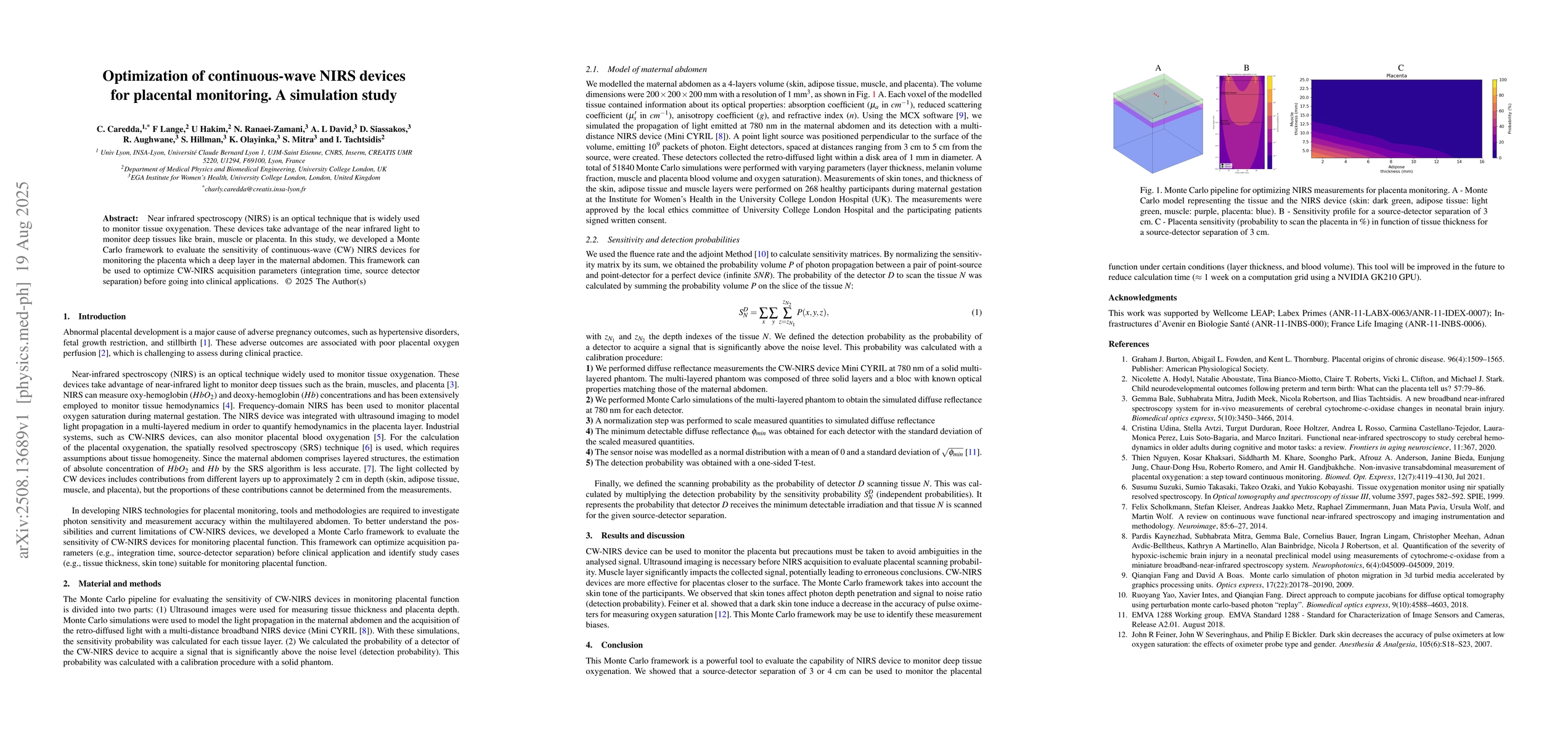 The research employs a Monte Carlo framework to evaluate the sensitivity of continuous-wave (CW) NIRS devices for placental monitoring, optimizing acquisition parameters such as integration time and source-detector separation before clinical applications.