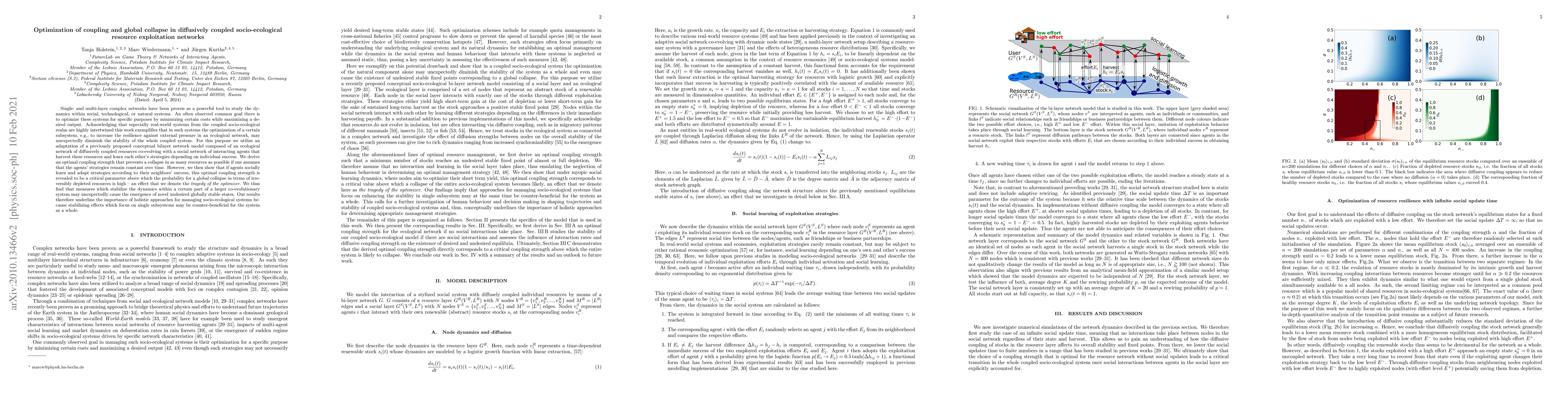 Single- and multi-layer complex networks have been proven as a powerful tool to study the dynamics within social, technological,or natural systems. An often observed common goal there is to optimize these systems for specific purposes by minimizing certain costs while maximizing a desired output. Acknowledging that especially real-world systems from the coupled socio-ecological realm are highly intertwined this work exemplifies that in such systems the optimization of a certain subsystem, e.g., to increase the resilience against external pressure in an ecological network, may unexpectedly diminish the stability of the whole coupled system. For this purpose we utilize an adaptation of a previously proposed conceptual bilayer network model composed of an ecological network of diffusively coupled resources co-evolving with a social network of interacting agents that harvest these resources and learn each other's strategies depending on individual success. We derive an optimal coupling strength that prevents a collapse in as many resources as possible if one assumes that the agents' strategies remain constant over time. However, we then show that if agents socially learn and adapt strategies according to their neighbors' success, this optimal coupling strength is revealed to be a critical parameter above which the probability for a global collapse in terms of irreversibly depleted resources is high -- an effect that we denote the tragedy of the optimizer. We thus find that measures which stabilize the dynamics within a certain part of a larger co-evolutionary system may unexpectedly cause the emergence of novel undesired globally stable states. Our results therefore underline the importance of holistic approaches for managing socio-ecological systems because stabilizing effects which focus on single subsystems may be counter-beneficial for the system as a whole.