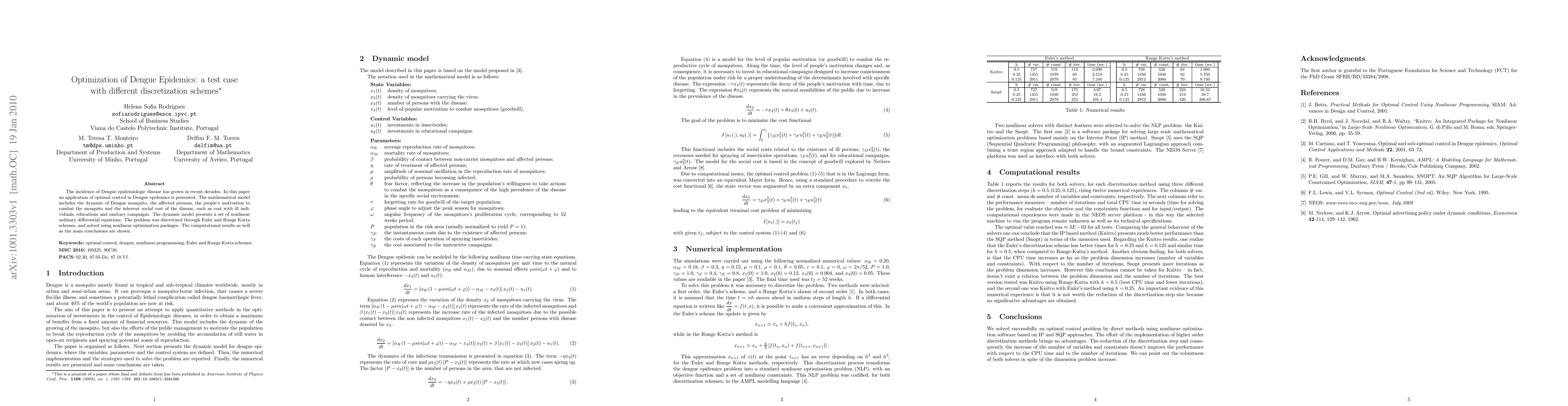 This paper applies optimal control theory to optimize Dengue epidemic management using a mathematical model that considers mosquito dynamics, human infection rates, public motivation to fight mosquitoes, and associated social costs. The model is discretized via Euler and Runge-Kutta methods and solved with nonlinear optimization techniques, providing insights into effective epidemic control strategies.