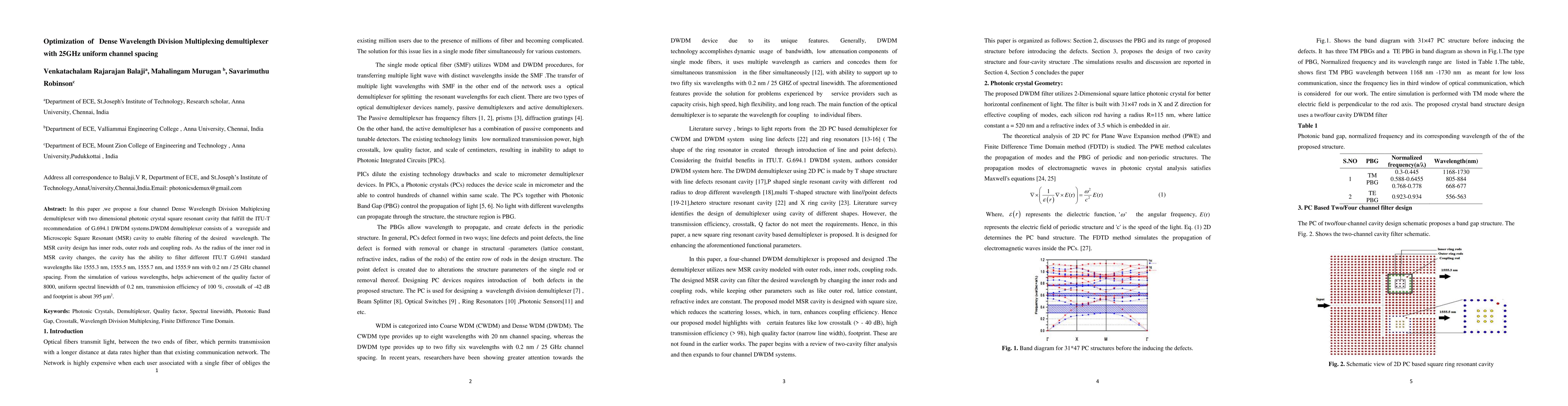 In this paper,we propose a four channel Dense Wavelength Division Multiplexing demultiplexer with two dimensional photonic crystal square resonant cavity that fulfill the ITU-T recommendation of G.694.1 DWDM systems.DWDM demultiplexer consists of a waveguide and Microscopic Square Resonant (MSR) cavity to enable filtering of the desired wavelength. The MSR cavity design has inner rods, outer rods and coupling rods. As the radius of the inner rod in MSR cavity changes, the cavity has the ability to filter different ITU.T G.6941 standard wavelengths like 1555.3 nm, 1555.5 nm, 1555.7 nm, and 1555.9 nm with 0.2 nm / 25 GHz channel spacing. From the simulation of various wavelengths, helps achievement of the quality factor of 8000, uniform spectral linewidth of 0.2 nm, transmission efficiency of 100 %, crosstalk of -42 dB and footprint is about 395 micro meter square.