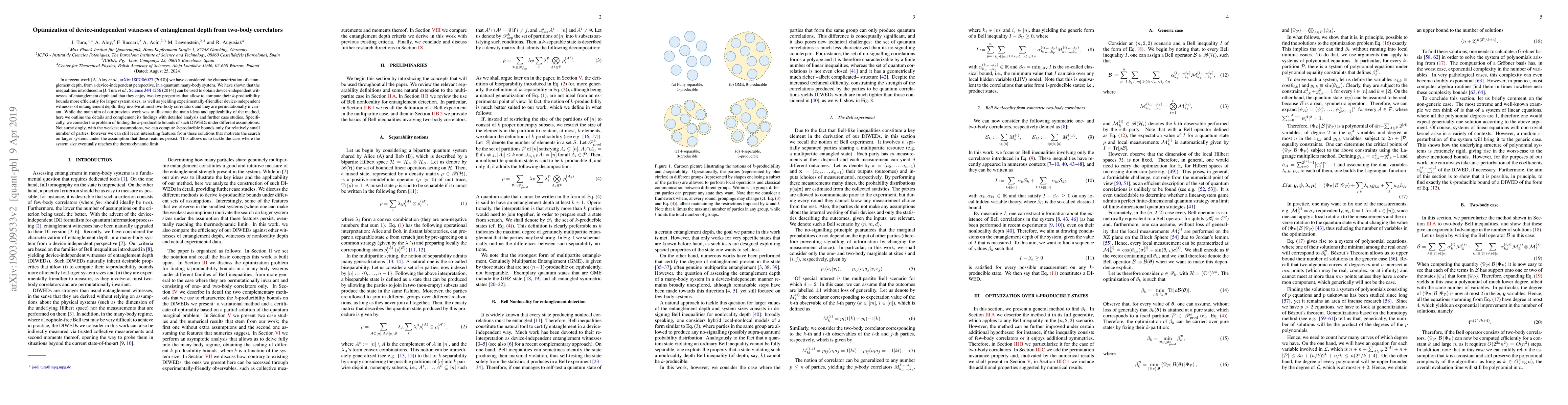 In a recent work [A. Aloy et al. arXiv:1807:06027 (2018)] we have considered the characterization of entanglement depth, from a device-independent perspective, in a quantum many-body system. We have shown that the inequalities introduced in [J. Tura et al. Science 344 1256 (2014)] can be used to obtain device-independent witnesses of entanglement depth and that they enjoy two key properties that allow to compute their $k$-producibility bounds more efficiently for larger system sizes, as well as yielding experimentally-friendlier device-independent witnesses of entanglement depth: they involve at most two-body correlators and they are permutationally invariant. While the main aim of our previous work was to illustrate the main ideas and applicability of the method, here we outline the details and complement its findings with detailed analysis and further case studies. Specifically, we consider the problem of finding the $k$-producible bounds of such DIWEDs under different assumptions. Not surprisingly, with the weakest assumptions, we can compute $k$-producible bounds only for relatively small number of parties; however we can still learn interesting features from these solutions that motivate the search on larger systems under the assumption that these features persist. This allows us to tackle the case where the system size eventually reaches the thermodynamic limit.