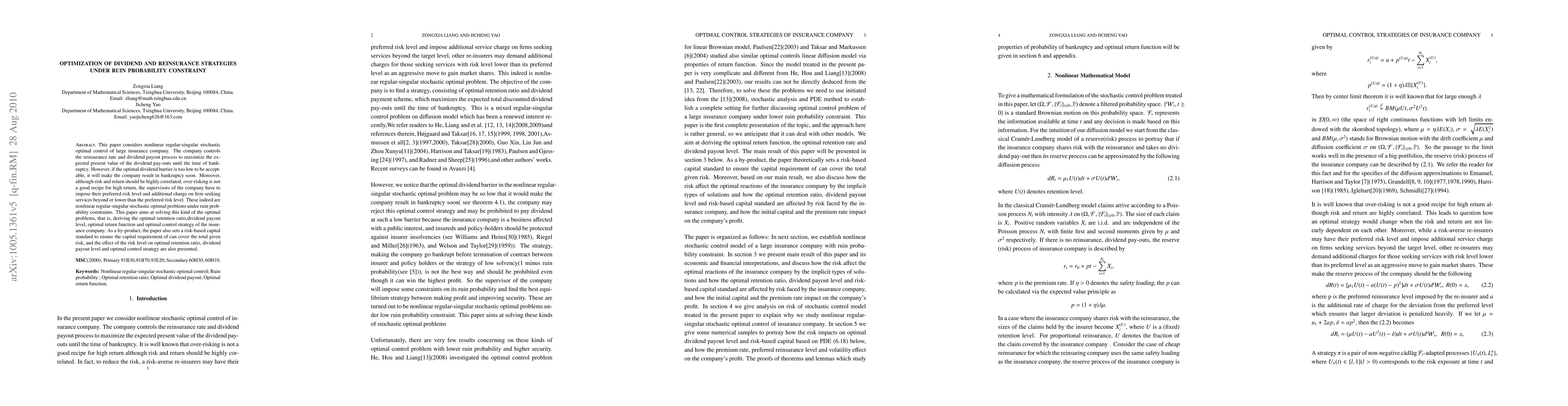 This paper considers nonlinear regular-singular stochastic optimal control of large insurance company. The company controls the reinsurance rate and dividend payout process to maximize the expected present value of the dividend pay-outs until the time of bankruptcy. However, if the optimal dividend barrier is too low to be acceptable, it will make the company result in bankruptcy soon. Moreover, although risk and return should be highly correlated, over-risking is not a good recipe for high return, the supervisors of the company have to impose their preferred risk level and additional charge on firm seeking services beyond or lower than the preferred risk level. These indeed are nonlinear regular-singular stochastic optimal problems under ruin probability constraints. This paper aims at solving this kind of the optimal problems, that is, deriving the optimal retention ratio,dividend payout level, optimal return function and optimal control strategy of the insurance company. As a by-product, the paper also sets a risk-based capital standard to ensure the capital requirement of can cover the total given risk, and the effect of the risk level on optimal retention ratio, dividend payout level and optimal control strategy are also presented.