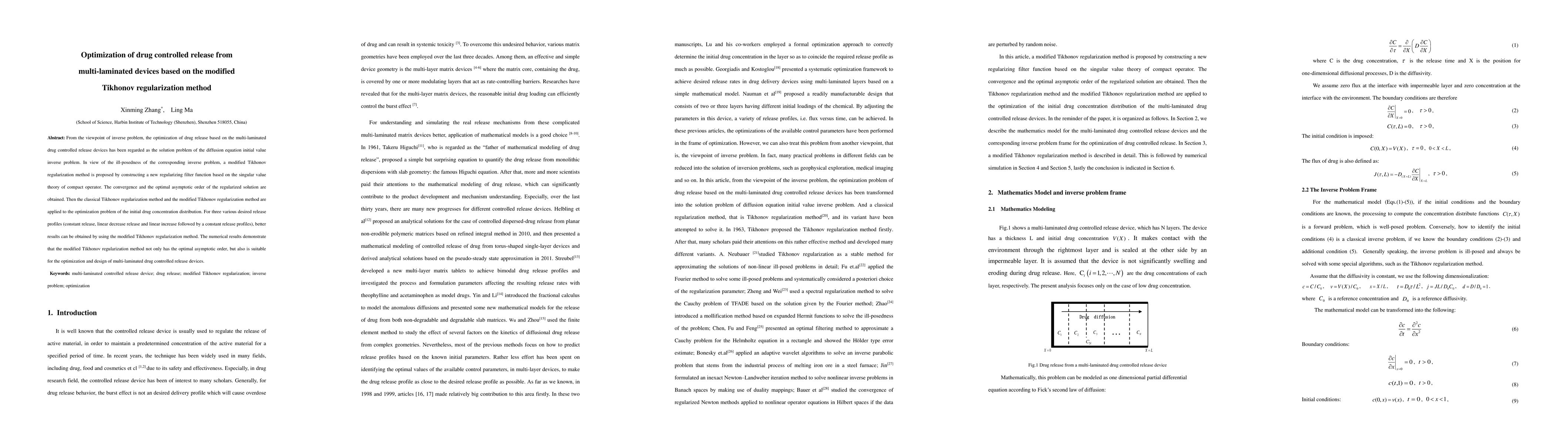 This paper proposes a modified Tikhonov regularization method to optimize drug release from multi-laminated devices, addressing the ill-posed inverse problem of the diffusion equation. The method achieves better results for various desired release profiles compared to the classical approach, demonstrating optimal asymptotic order and suitability for device design.