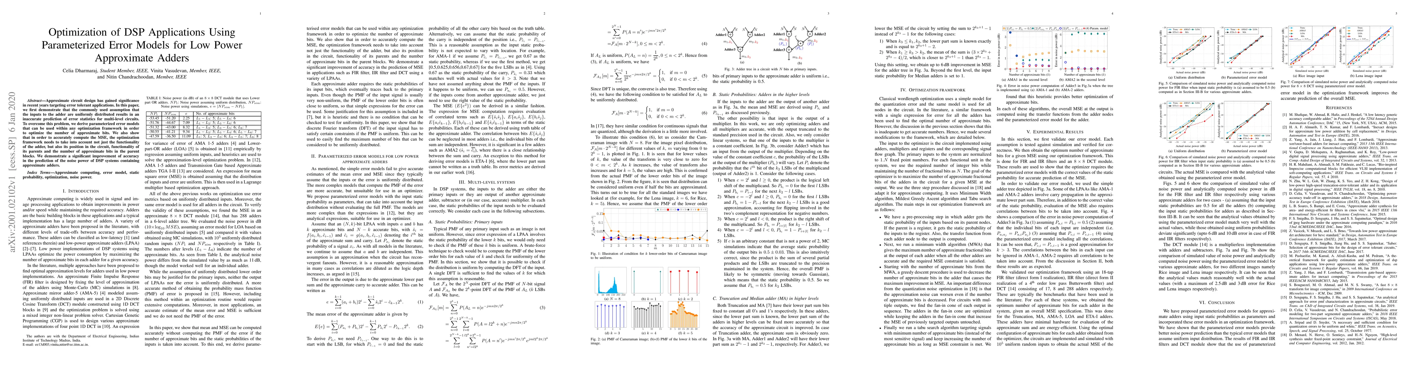 This paper develops parameterized error models to optimize low-power approximate adders in DSP applications, addressing inaccuracies from uniform input distribution assumptions. It shows that optimizing the number of approximate bits requires considering circuit position, parent functionality, and approximate bits in parent blocks, leading to more accurate predictions of noise power in DSP systems.