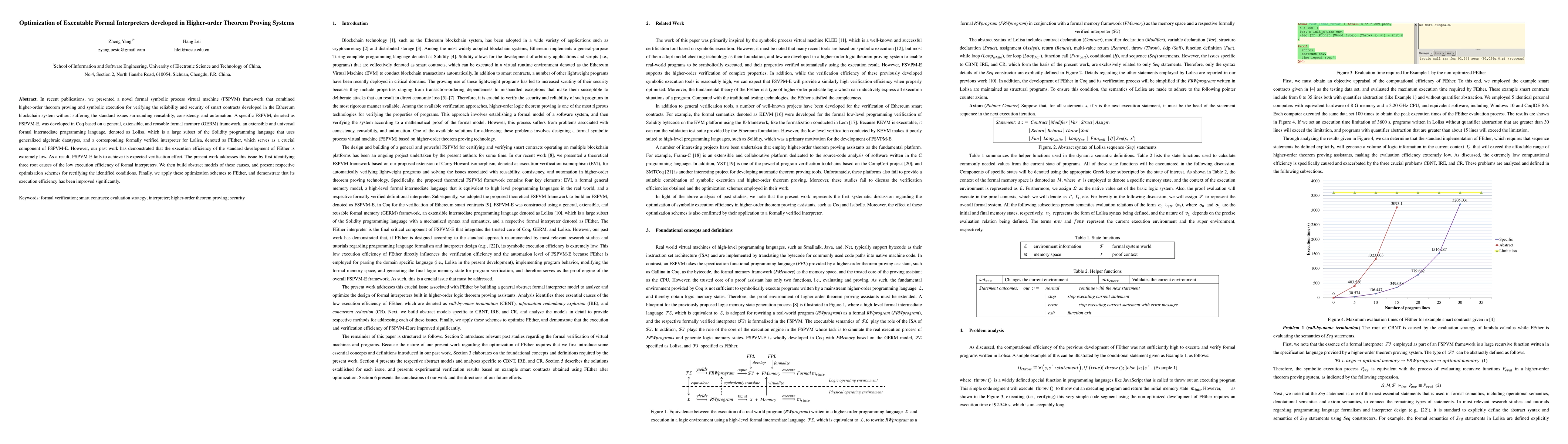 In recent publications, we presented a novel formal symbolic process virtual machine (FSPVM) framework that combined higher-order theorem proving and symbolic execution for verifying the reliability and security of smart contracts developed in the Ethereum blockchain system without suffering the standard issues surrounding reusability, consistency, and automation. A specific FSPVM, denoted as FSPVM-E, was developed in Coq based on a general, extensible, and reusable formal memory (GERM) framework, an extensible and universal formal intermediate programming language, denoted as Lolisa, which is a large subset of the Solidity programming language that uses generalized algebraic datatypes, and a corresponding formally verified interpreter for Lolisa, denoted as FEther, which serves as a crucial component of FSPVM-E. However, our past work has demonstrated that the execution efficiency of the standard development of FEther is extremely low. As a result, FSPVM-E fails to achieve its expected verification effect. The present work addresses this issue by first identifying three root causes of the low execution efficiency of formal interpreters. We then build abstract models of these causes, and present respective optimization schemes for rectifying the identified conditions. Finally, we apply these optimization schemes to FEther, and demonstrate that its execution efficiency has been improved significantly.