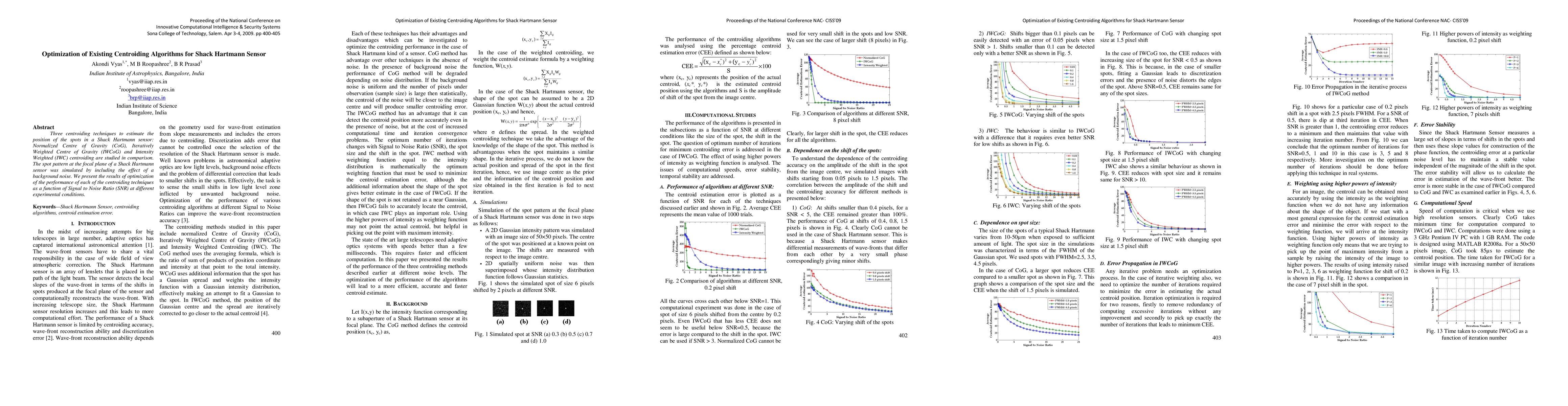 Three centroiding techniques to estimate the position of the spots in a Shack Hartmann sensor: Normalized Centre of Gravity (CoG), Iteratively Weighted Centre of Gravity (IWCoG) and Intensity Weighted (IWC) centroiding are studied in comparison. The spot pattern at the focal plane of a Shack Hartmann sensor was simulated by including the effect of a background noise. We present the results of optimization of the performance of each of the centroiding techniques as a function of Signal to Noise Ratio (SNR) at different experimental conditions.