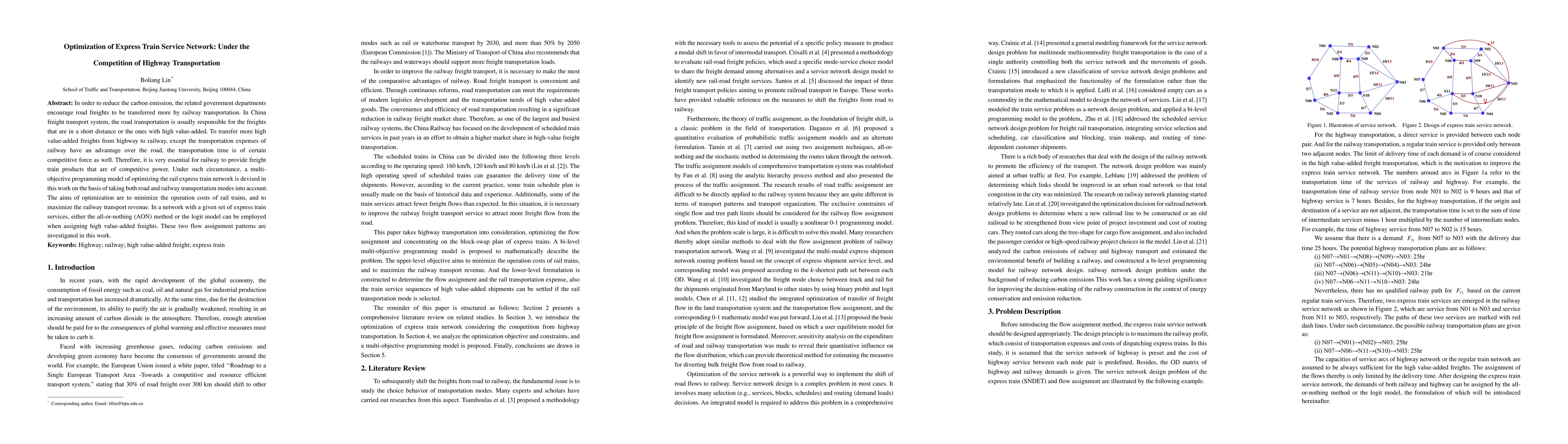 This paper proposes a multi-objective programming model to optimize China's express train network, aiming to minimize operation costs and maximize revenue by transferring high value-added freights from highways to railways. The study investigates the application of the all-or-nothing method and logit model for freight assignment in the context of competing transportation modes.