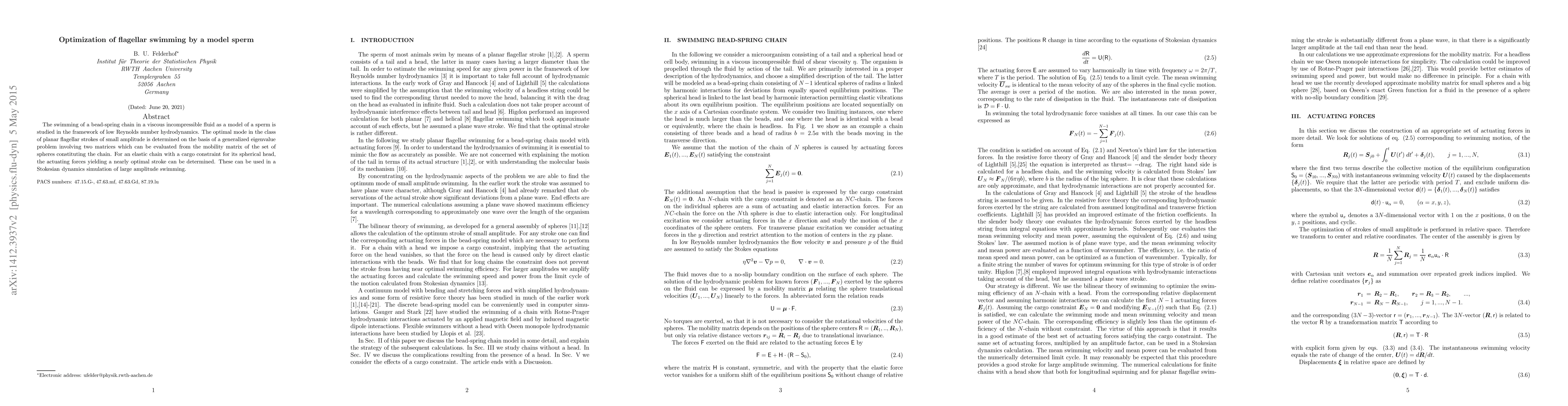 The study uses a bead-spring chain model to simulate sperm swimming in a viscous fluid under low Reynolds number hydrodynamics. It determines optimal flagellar strokes through a generalized eigenvalue problem involving mobility matrices, and applies actuating forces to a constrained chain for nearly optimal swimming.