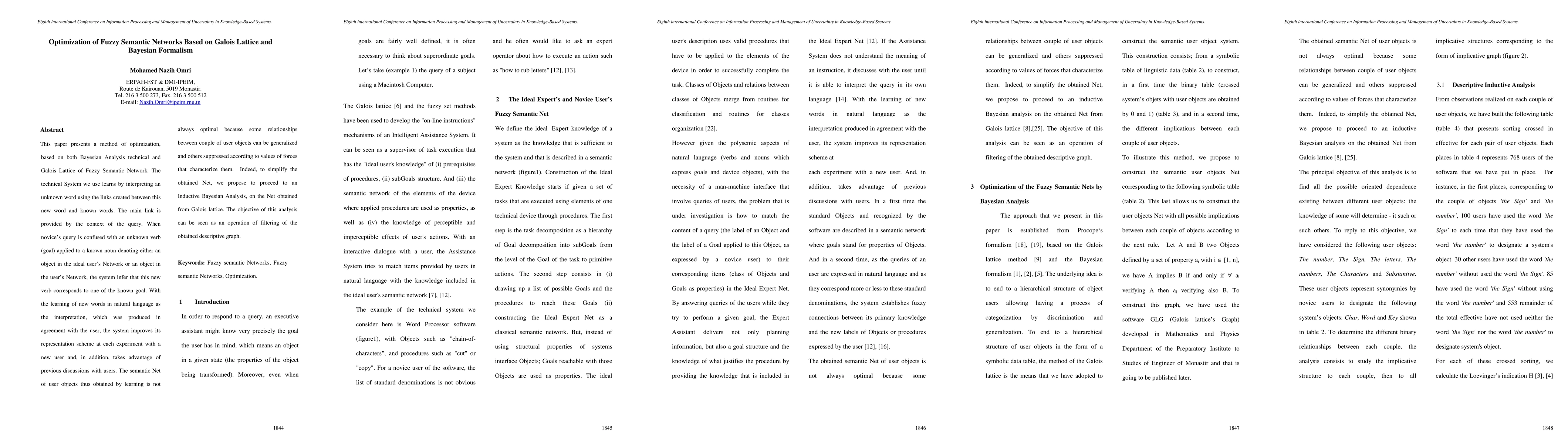 This paper presents a method of optimization, based on both Bayesian Analysis technical and Galois Lattice of Fuzzy Semantic Network. The technical System we use learns by interpreting an unknown word using the links created between this new word and known words. The main link is provided by the context of the query. When novice's query is confused with an unknown verb (goal) applied to a known noun denoting either an object in the ideal user's Network or an object in the user's Network, the system infer that this new verb corresponds to one of the known goal. With the learning of new words in natural language as the interpretation, which was produced in agreement with the user, the system improves its representation scheme at each experiment with a new user and, in addition, takes advantage of previous discussions with users. The semantic Net of user objects thus obtained by learning is not always optimal because some relationships between couple of user objects can be generalized and others suppressed according to values of forces that characterize them. Indeed, to simplify the obtained Net, we propose to proceed to an Inductive Bayesian Analysis, on the Net obtained from Galois lattice. The objective of this analysis can be seen as an operation of filtering of the obtained descriptive graph.
