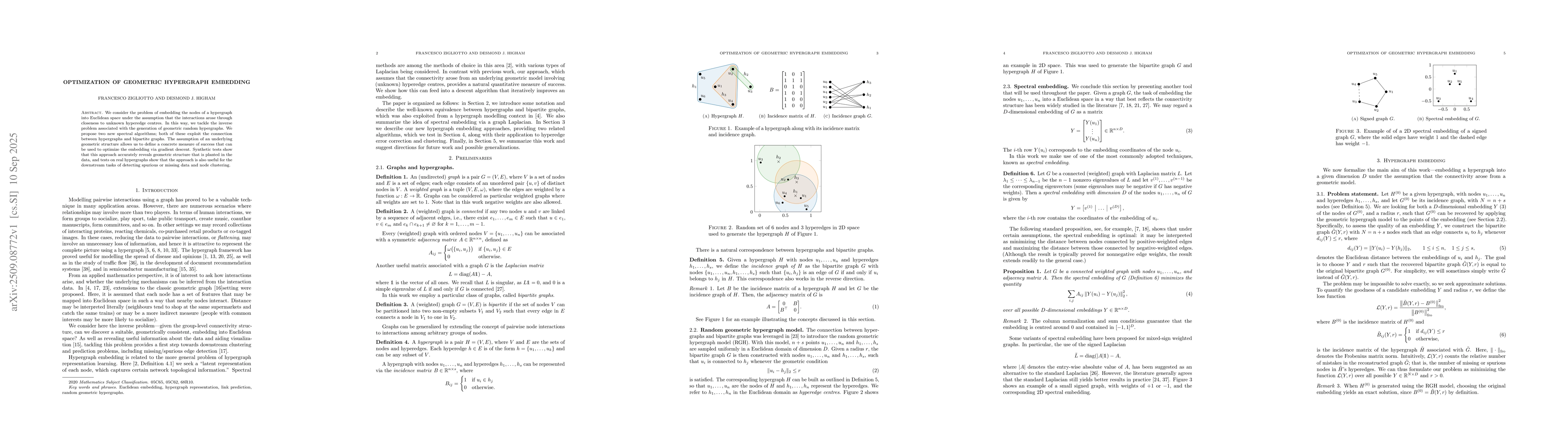 We consider the problem of embedding the nodes of a hypergraph into Euclidean space under the assumption that the interactions arose through closeness to unknown hyperedge centres. In this way, we tackle the inverse problem associated with the generation of geometric random hypergraphs. We propose two new spectral algorithms; both of these exploit the connection between hypergraphs and bipartite graphs. The assumption of an underlying geometric structure allows us to define a concrete measure of success that can be used to optimize the embedding via gradient descent. Synthetic tests show that this approach accurately reveals geometric structure that is planted in the data, and tests on real hypergraphs show that the approach is also useful for the downstream tasks of detecting spurious or missing data and node clustering.
