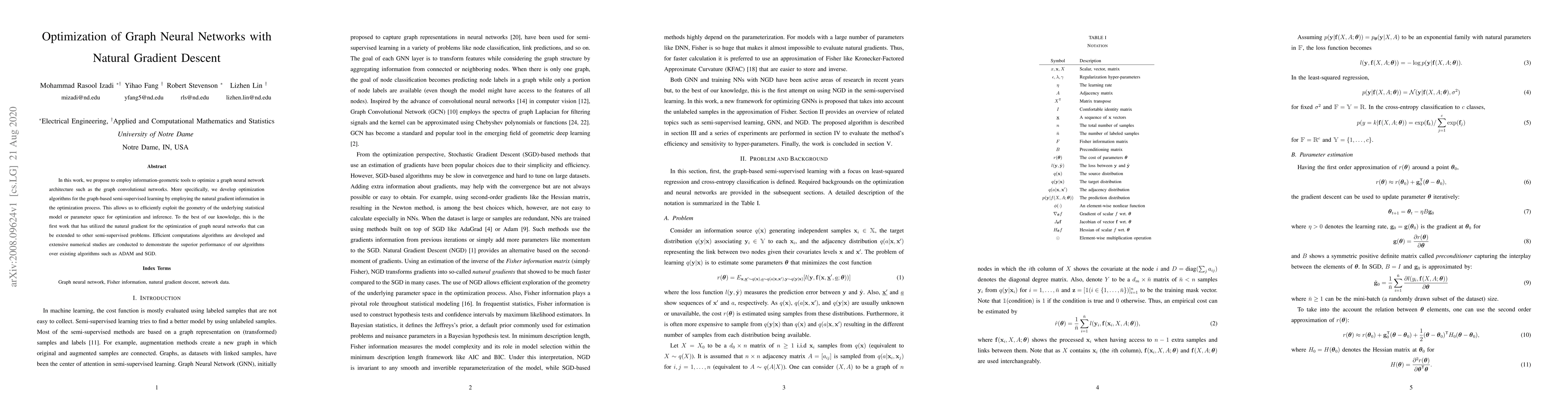 This paper proposes using natural gradient descent to optimize graph neural networks, specifically graph convolutional networks, for semi-supervised learning. The developed algorithms leverage the geometry of the parameter space for improved efficiency and performance, outperforming existing methods like ADAM and SGD.