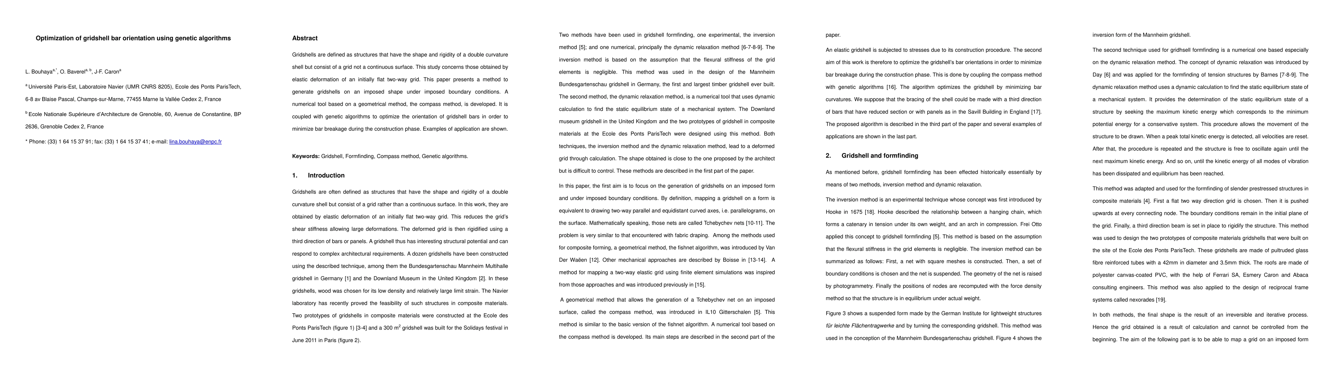 Gridshells are defined as structures that have the shape and rigidity of a double curvature shell but consist of a grid instead of a continuous surface. This study concerns those obtained by elastic deformation of an initially flat two-way grid. This paper presents a novel approach to generate gridshells on an imposed shape under imposed boundary conditions. A numerical tool based on a geometrical method, the compass method, is developed. It is coupled with genetic algorithms to optimize the orientation of gridshell bars in order to minimize the stresses and therefore to avoid bar breakage during the construction phase. Examples of application are shown.