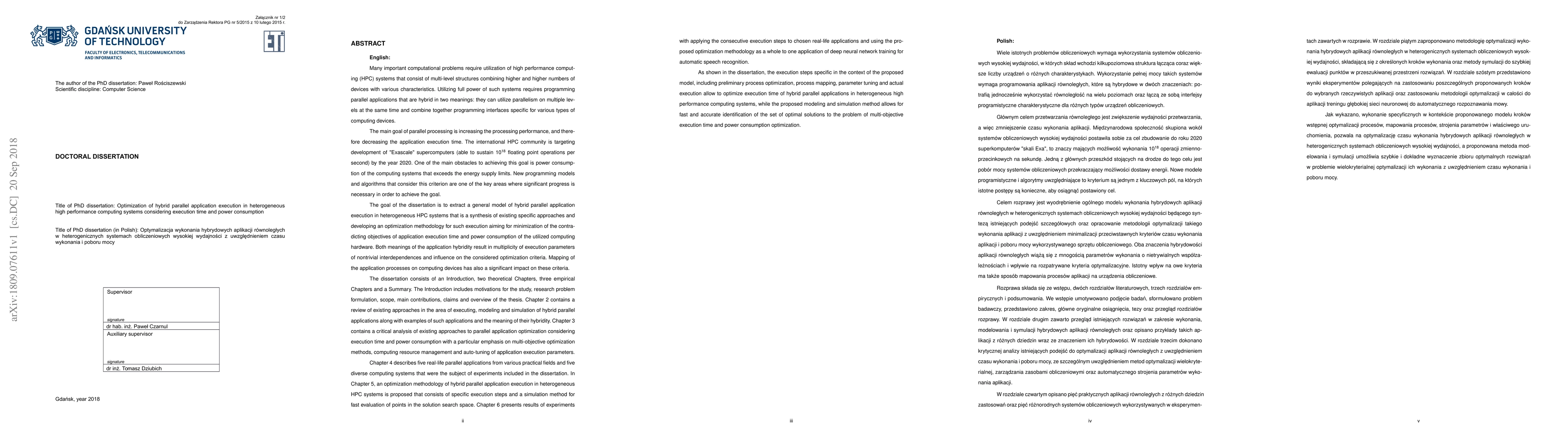 This paper develops an optimization methodology for executing hybrid parallel applications in heterogeneous high-performance computing systems, aiming to minimize both execution time and power consumption. It synthesizes existing approaches and addresses the complex interdependences of execution parameters and the impact of application process mapping on computing devices.