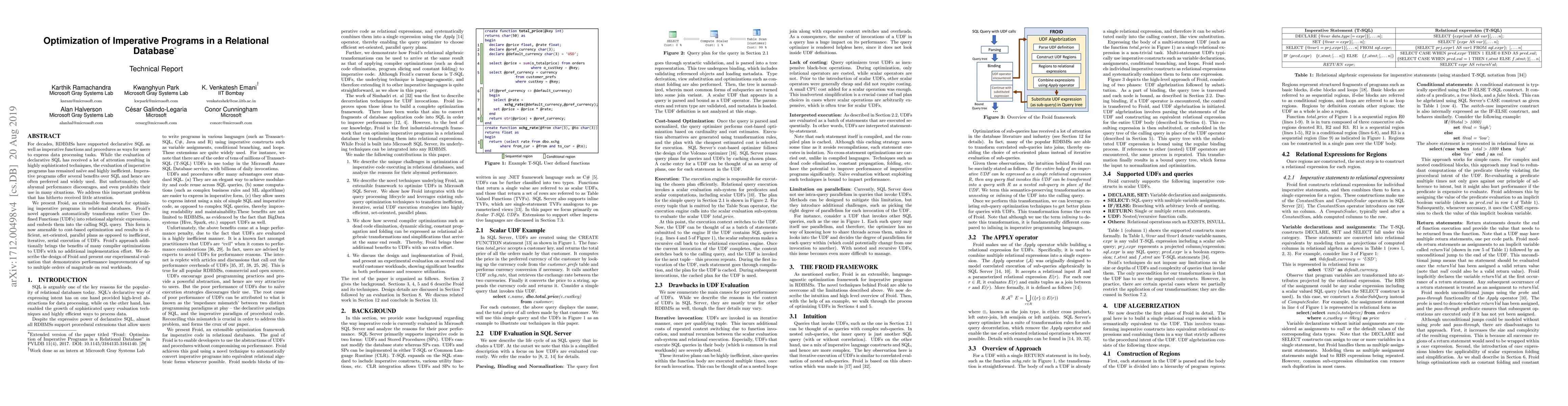 The paper introduces Froid, a framework optimizing imperative programs in relational databases by transforming User Defined Functions into relational algebraic expressions, enabling cost-based optimization and achieving significant performance improvements. Experimental results show multiple orders of magnitude performance gains over traditional methods.