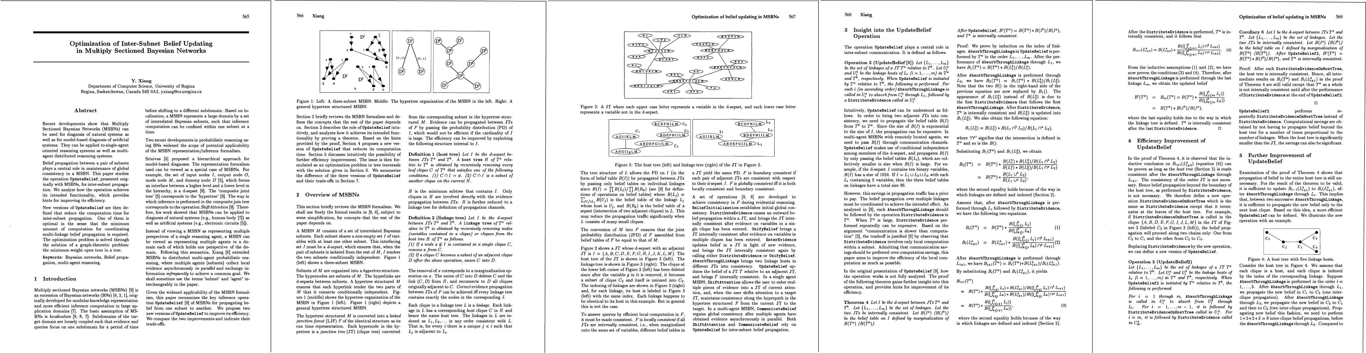 This paper optimizes the UpdateBelief operation in Multiply Sectioned Bayesian Networks (MSBNs) to enhance inter-subnet belief propagation efficiency. It introduces two new versions of UpdateBelief, one of which is optimal, solved via a graph-theoretic minimum weight open tour problem.