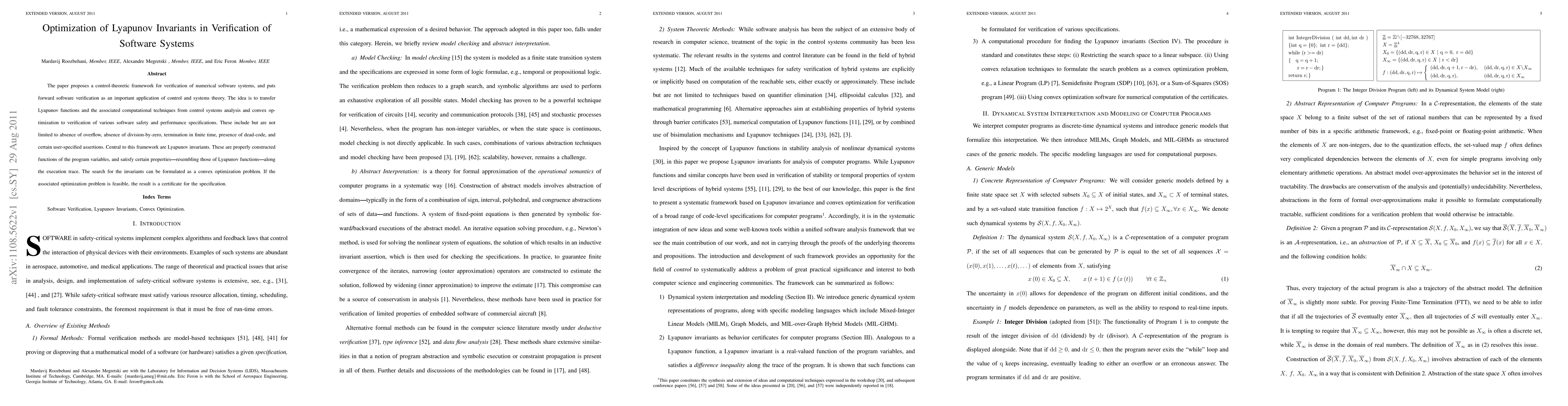 The paper introduces a control-theoretic framework for verifying numerical software systems using Lyapunov invariants, transferring techniques from control systems analysis to ensure safety and performance specifications. The optimization of these invariants is formulated as a convex problem to provide certificates for various software properties.