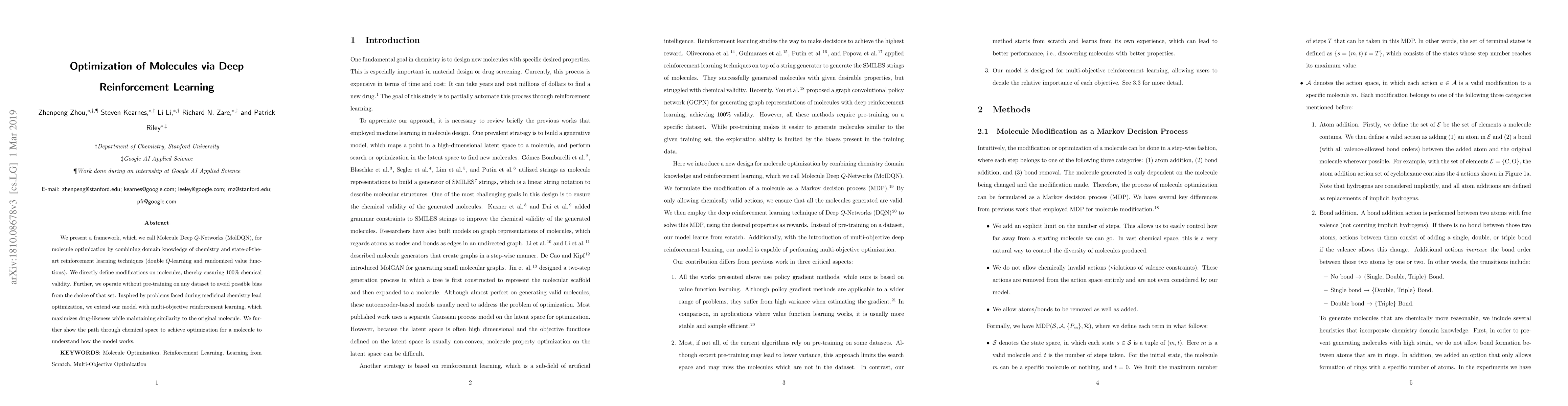 This paper introduces Molecule Deep $Q$-Networks (MolDQN), a reinforcement learning framework that optimizes molecules using domain knowledge of chemistry and advanced techniques like double $Q$-learning. The model ensures 100% chemical validity without pre-training, and it employs multi-objective reinforcement learning to maximize drug-likeness while preserving molecular similarity.