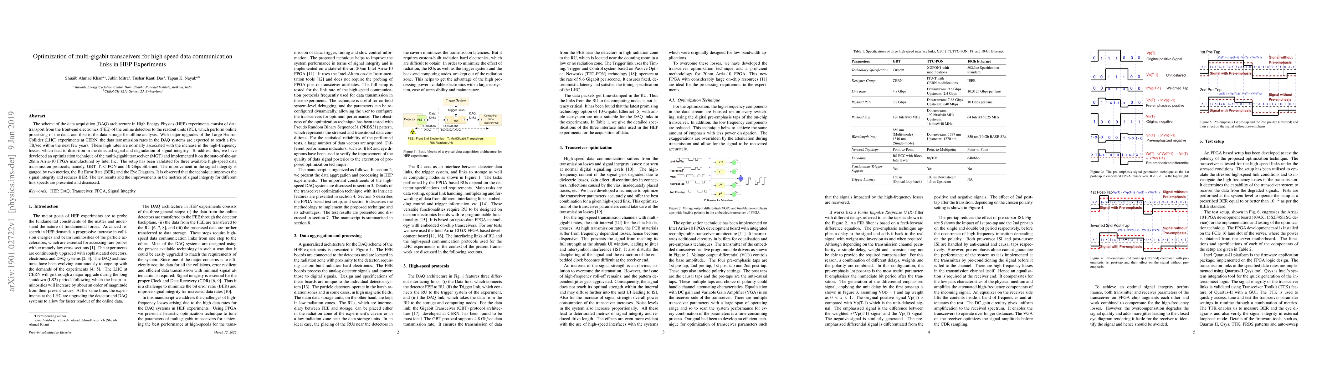 This paper presents an optimization technique for multi-gigabit transceivers to enhance data transmission rates in High Energy Physics experiments, validated on a 20nm Arria-10 FPGA. The technique improves signal integrity and reduces Bit Error Rate, tested across GBT, TTC-PON, and 10 Gbps Ethernet protocols.