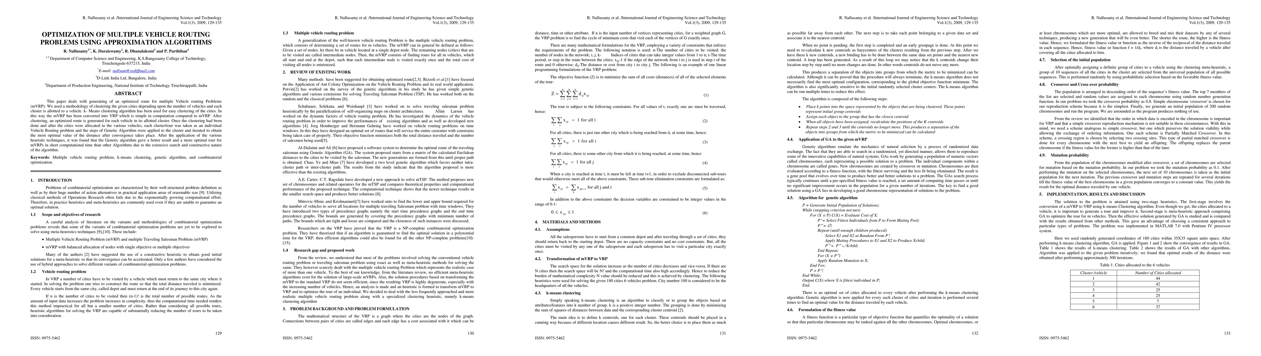 This paper deals with generating of an optimized route for multiple Vehicle routing Problems (mVRP). We used a methodology of clustering the given cities depending upon the number of vehicles and each cluster is allotted to a vehicle. k- Means clustering algorithm has been used for easy clustering of the cities. In this way the mVRP has been converted into VRP which is simple in computation compared to mVRP. After clustering, an optimized route is generated for each vehicle in its allotted cluster. Once the clustering had been done and after the cities were allocated to the various vehicles, each cluster/tour was taken as an individual Vehicle Routing problem and the steps of Genetic Algorithm were applied to the cluster and iterated to obtain the most optimal value of the distance after convergence takes place. After the application of the various heuristic techniques, it was found that the Genetic algorithm gave a better result and a more optimal tour for mVRPs in short computational time than other Algorithms due to the extensive search and constructive nature of the algorithm.